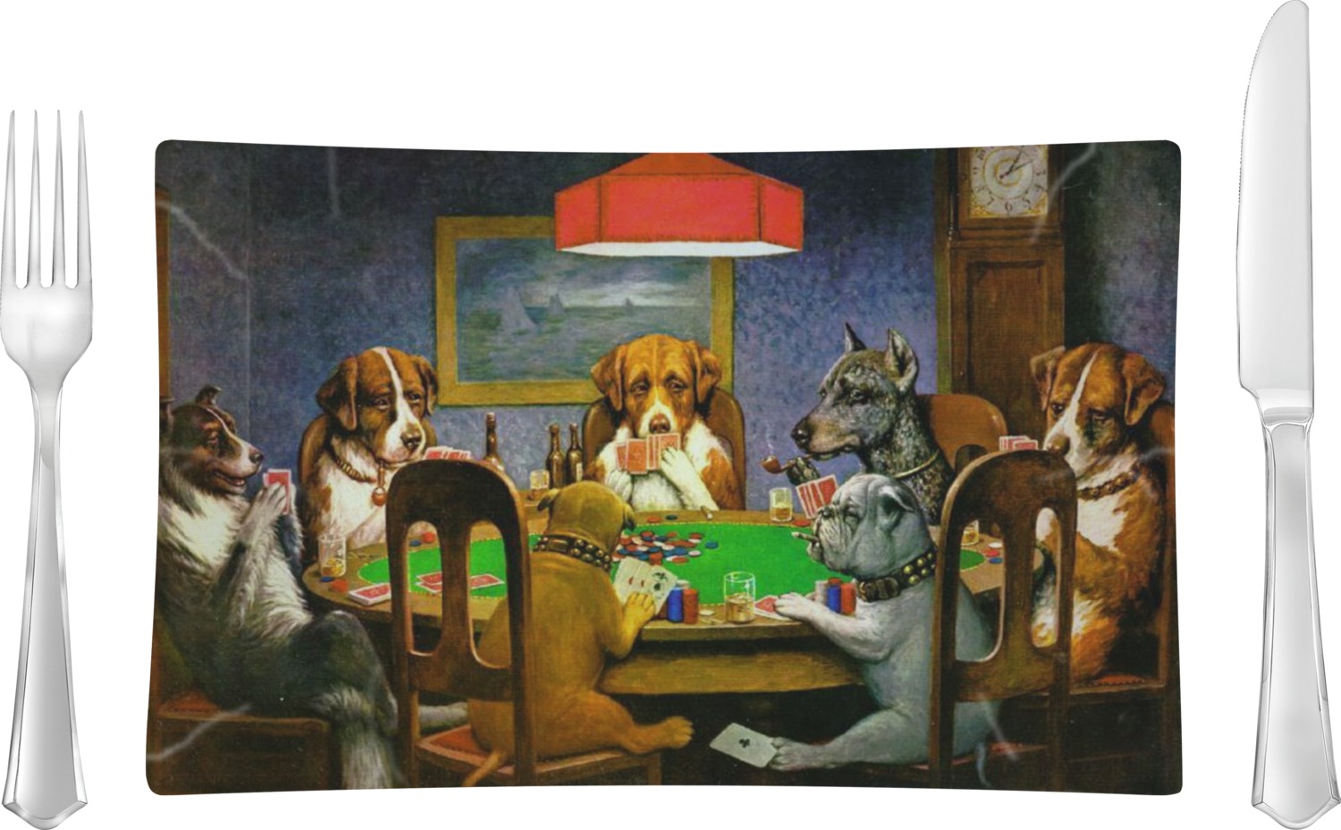 Dogs Playing Poker refers collectively to an 1894 painting, a series of sixteen oil paintings, and a 1910 painting by Cassius Marcellus Coolidge. Brown & Bigelow commissioned the 16 painting series in 1903 to advertise cigars. All eighteen paintings in the series feature personified dogs, but the eleven in which dogs are seated around a card table have become well known in the United States as examples of Kitsch art in home decoration. Source: Wikipedia