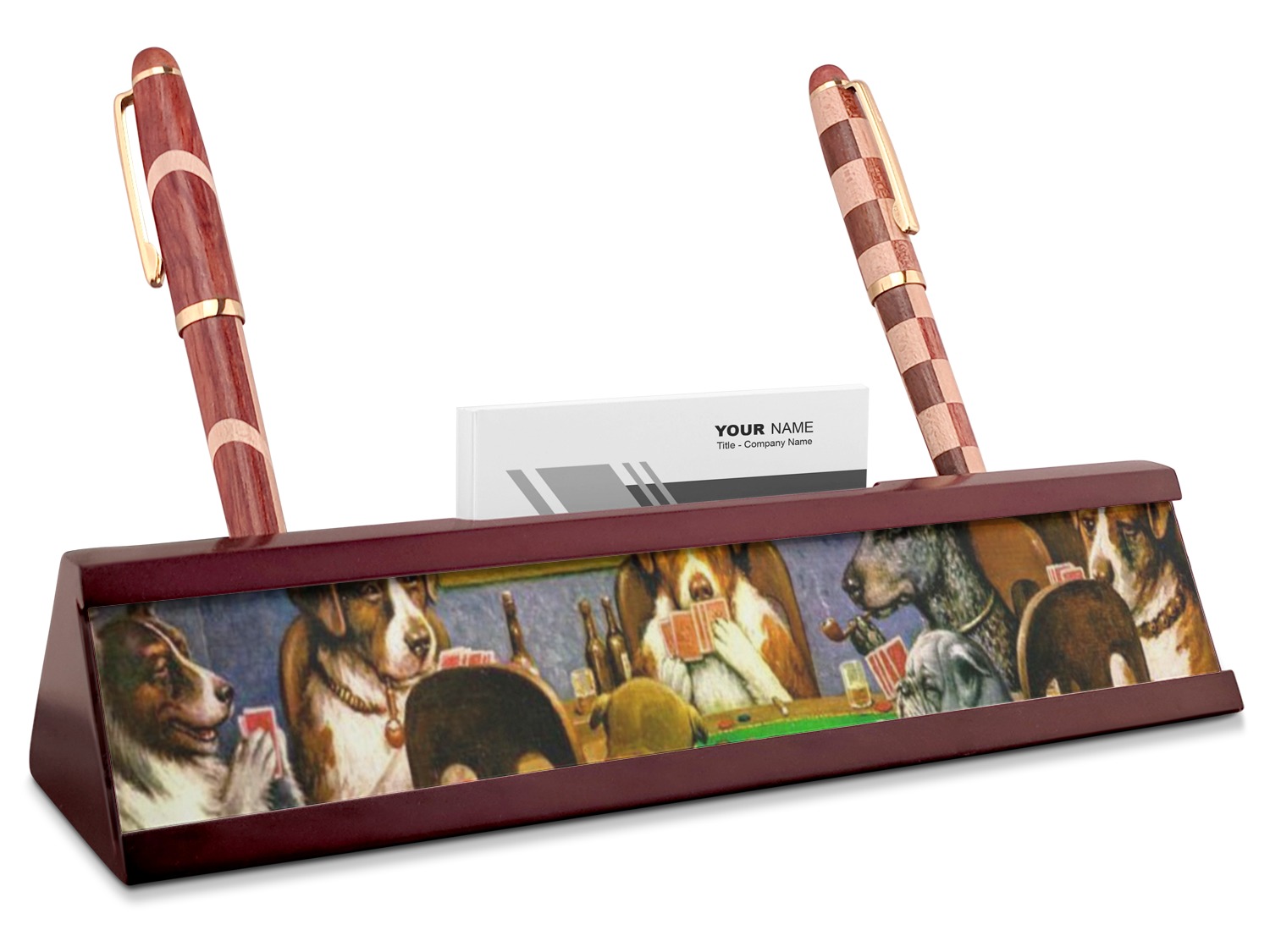 Your desk name plates are crafted from a high-quality, dark-cherry mahogany. At approximately 9.5 by 1.875 by 2.5 inches, this name plaque will fit perfectly, front and center, on your desk. Your customization spans across the entire face of the nameplate. Behind the nameplate lies a skinny slot that can fit approximately 15, traditionally-sized, business cards. You can also store your writing utensils on either side of this custom desk name plate.