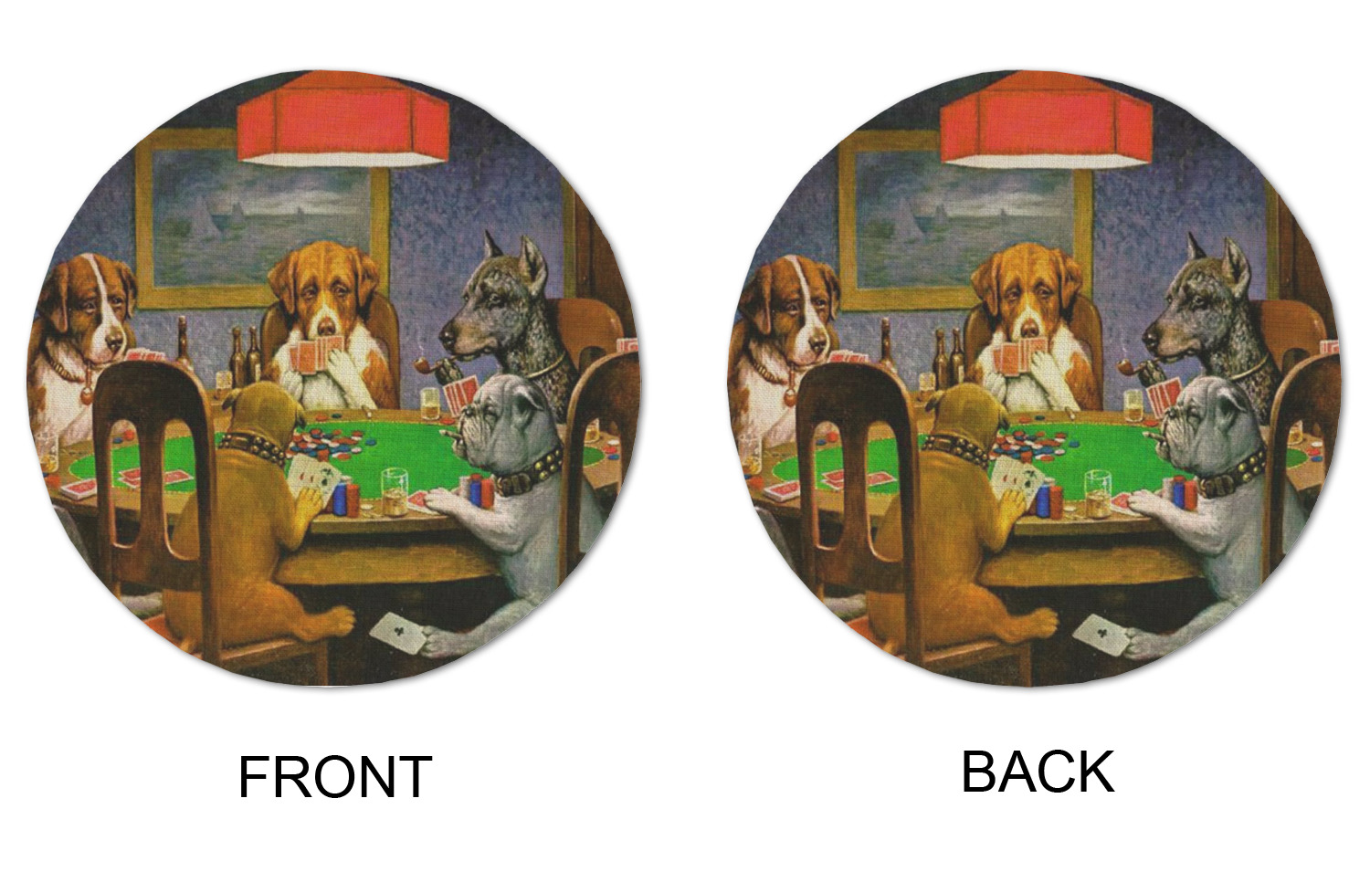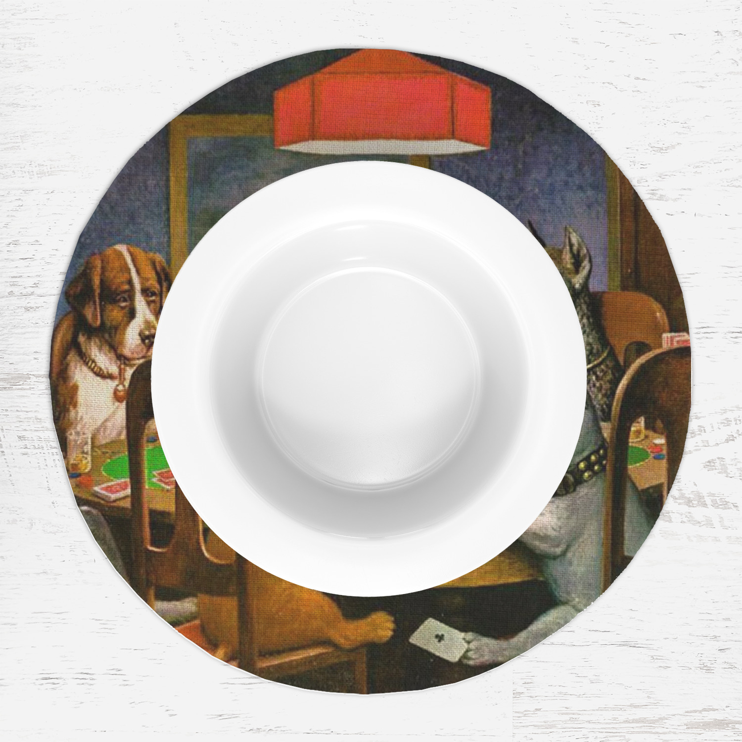 Dogs Playing Poker refers collectively to an 1894 painting, a series of sixteen oil paintings, and a 1910 painting by Cassius Marcellus Coolidge. Brown & Bigelow commissioned the 16 painting series in 1903 to advertise cigars. All eighteen paintings in the series feature personified dogs, but the eleven in which dogs are seated around a card table have become well known in the United States as examples of Kitsch art in home decoration. Source: Wikipedia