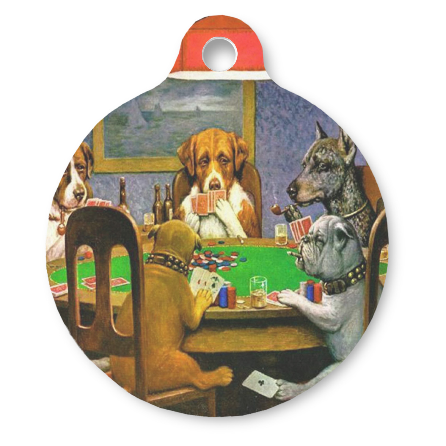 Dogs Playing Poker refers collectively to an 1894 painting, a series of sixteen oil paintings, and a 1910 painting by Cassius Marcellus Coolidge. Brown & Bigelow commissioned the 16 painting series in 1903 to advertise cigars. All eighteen paintings in the series feature personified dogs, but the eleven in which dogs are seated around a card table have become well known in the United States as examples of Kitsch art in home decoration. Source: Wikipedia