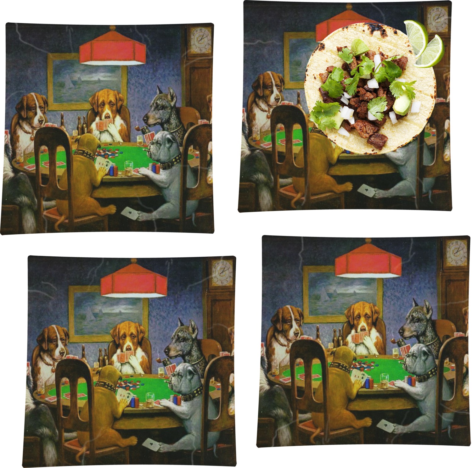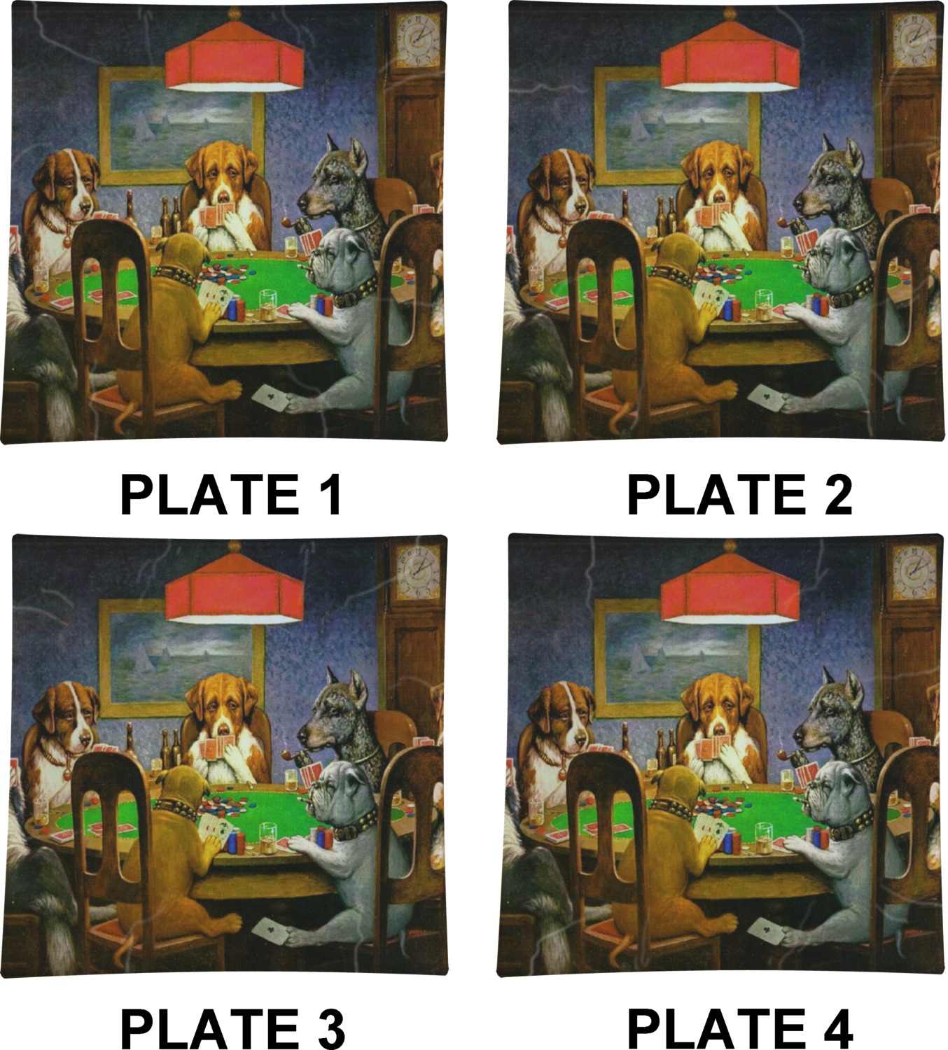 Dogs Playing Poker refers collectively to an 1894 painting, a series of sixteen oil paintings, and a 1910 painting by Cassius Marcellus Coolidge. Brown & Bigelow commissioned the 16 painting series in 1903 to advertise cigars. All eighteen paintings in the series feature personified dogs, but the eleven in which dogs are seated around a card table have become well known in the United States as examples of Kitsch art in home decoration. Source: Wikipedia