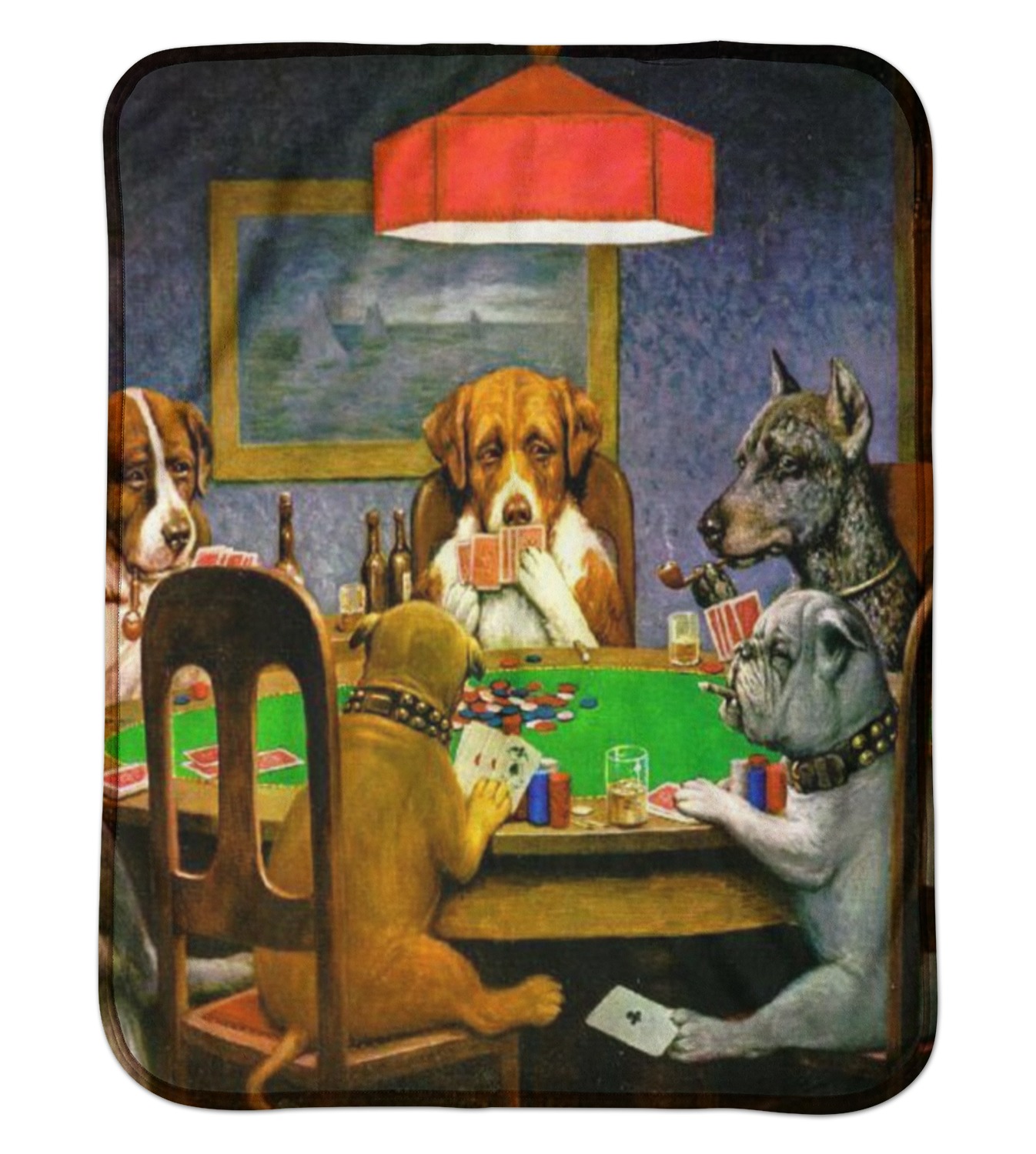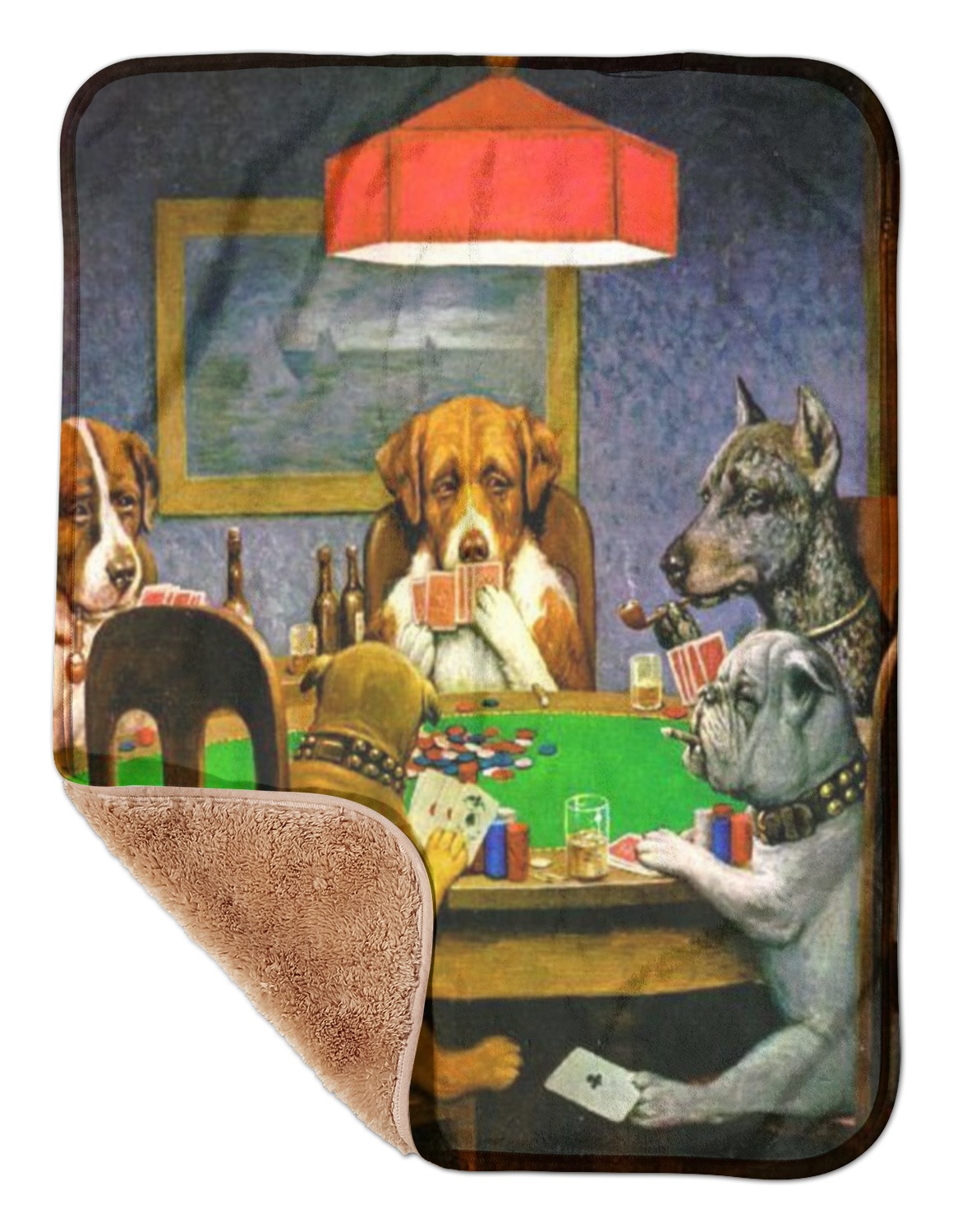 Dogs Playing Poker refers collectively to an 1894 painting, a series of sixteen oil paintings, and a 1910 painting by Cassius Marcellus Coolidge. Brown & Bigelow commissioned the 16 painting series in 1903 to advertise cigars. All eighteen paintings in the series feature personified dogs, but the eleven in which dogs are seated around a card table have become well known in the United States as examples of Kitsch art in home decoration. Source: Wikipedia