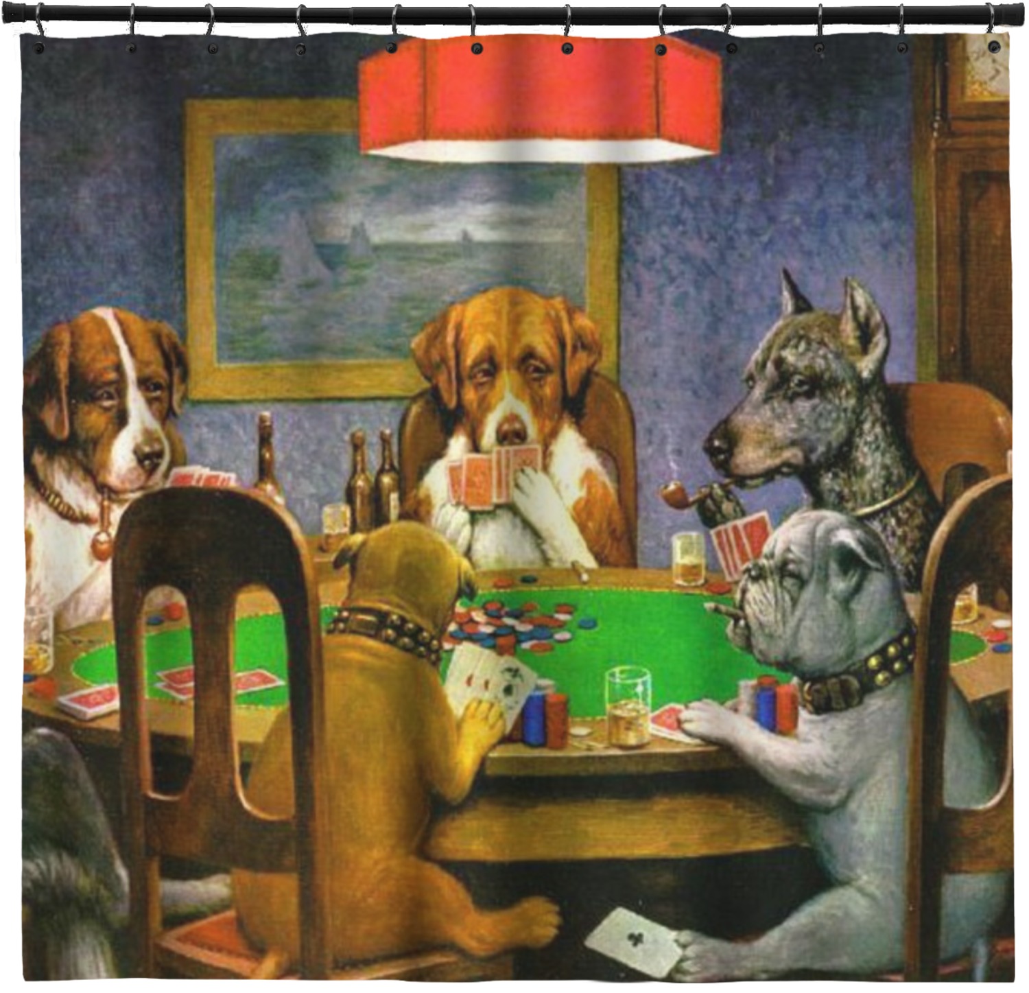 Dogs Playing Poker refers collectively to an 1894 painting, a series of sixteen oil paintings, and a 1910 painting by Cassius Marcellus Coolidge. Brown & Bigelow commissioned the 16 painting series in 1903 to advertise cigars. All eighteen paintings in the series feature personified dogs, but the eleven in which dogs are seated around a card table have become well known in the United States as examples of Kitsch art in home decoration. Source: Wikipedia