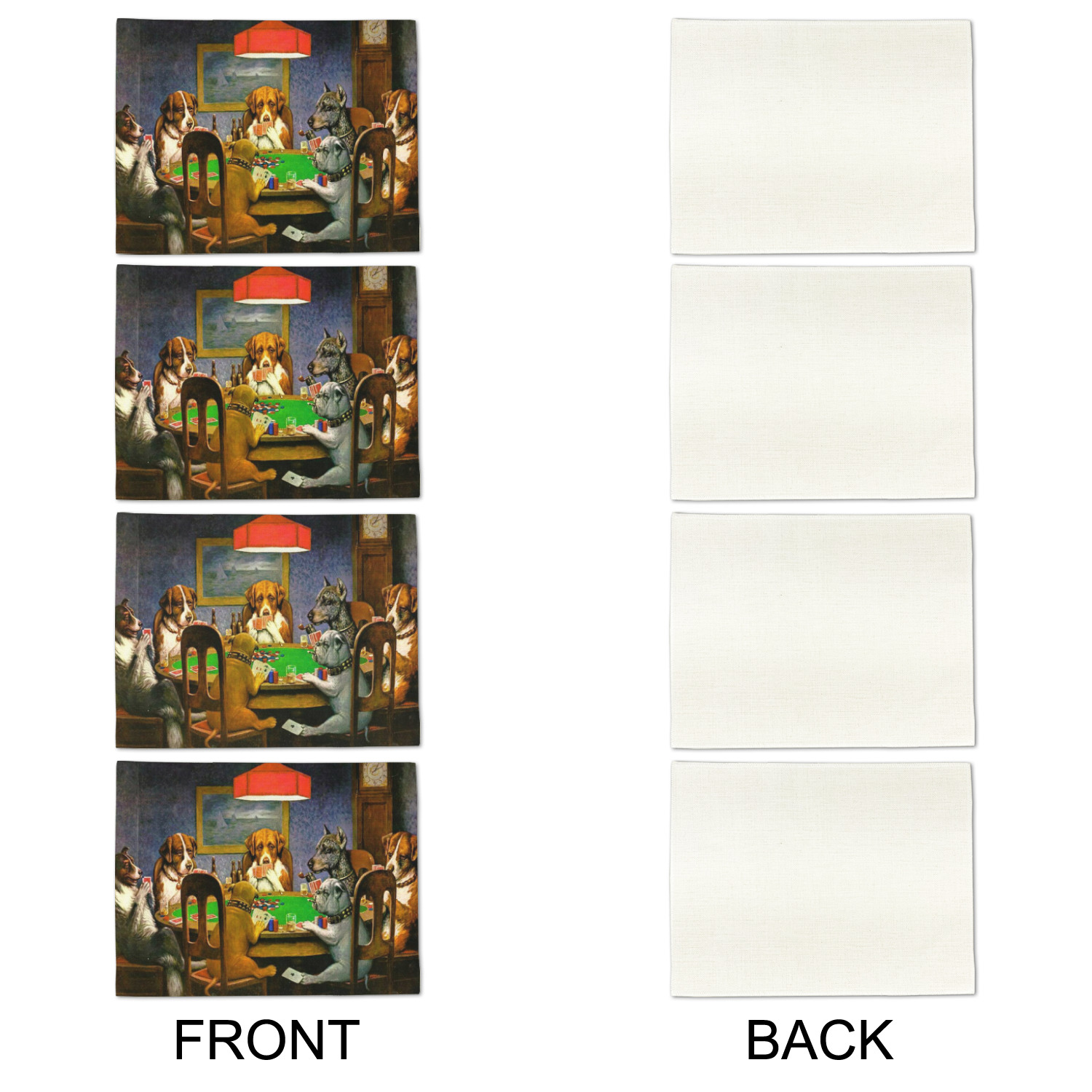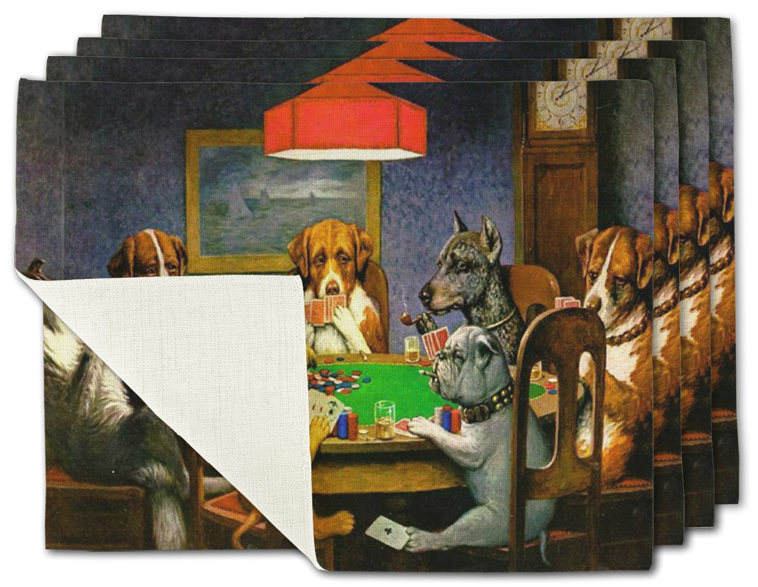 Dogs Playing Poker refers collectively to an 1894 painting, a series of sixteen oil paintings, and a 1910 painting by Cassius Marcellus Coolidge. Brown & Bigelow commissioned the 16 painting series in 1903 to advertise cigars. All eighteen paintings in the series feature personified dogs, but the eleven in which dogs are seated around a card table have become well known in the United States as examples of Kitsch art in home decoration. Source: Wikipedia