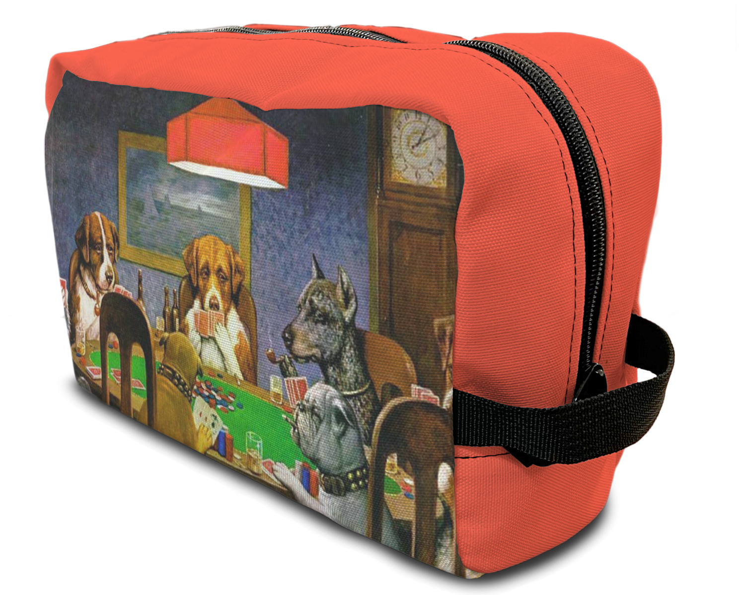 Our toiletry bag has the traditional dopp kit design i.e. a side to side zippered closure, giving you easy access to all the contents inside and a sturdy handle on one side of the bag. The canvas fabric for dopp kits is printed, then cut and sewn here in the USA.