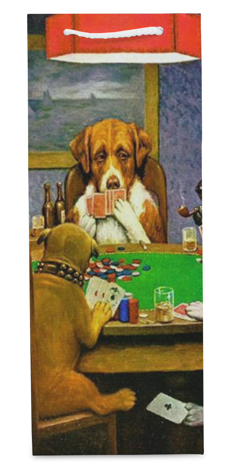 Dogs Playing Poker refers collectively to an 1894 painting, a series of sixteen oil paintings, and a 1910 painting by Cassius Marcellus Coolidge. Brown & Bigelow commissioned the 16 painting series in 1903 to advertise cigars. All eighteen paintings in the series feature personified dogs, but the eleven in which dogs are seated around a card table have become well known in the United States as examples of Kitsch art in home decoration. Source: Wikipedia
