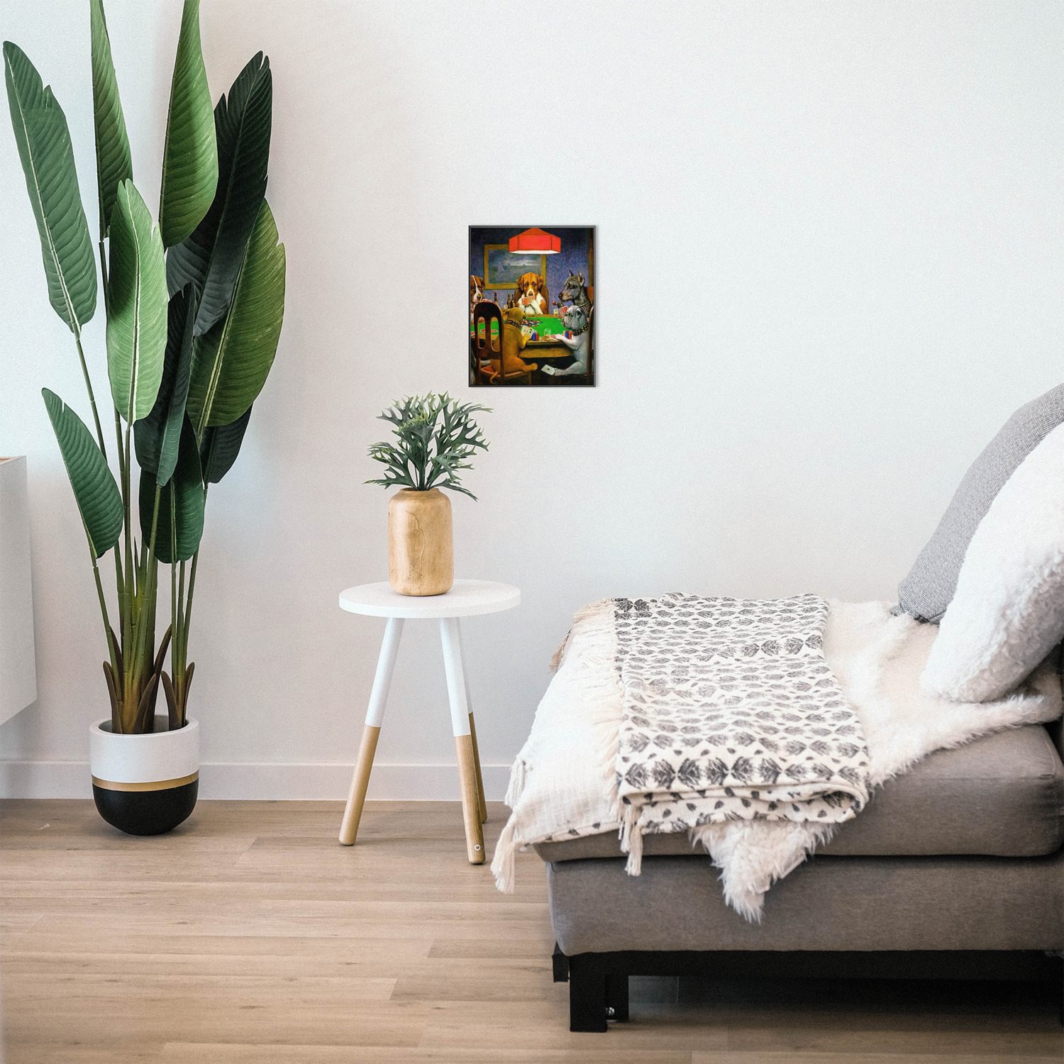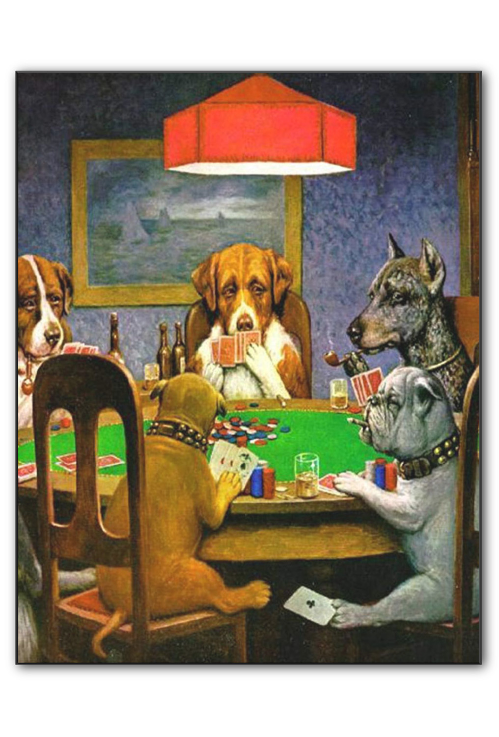 Dogs Playing Poker refers collectively to an 1894 painting, a series of sixteen oil paintings, and a 1910 painting by Cassius Marcellus Coolidge. Brown & Bigelow commissioned the 16 painting series in 1903 to advertise cigars. All eighteen paintings in the series feature personified dogs, but the eleven in which dogs are seated around a card table have become well known in the United States as examples of Kitsch art in home decoration. Source: Wikipedia