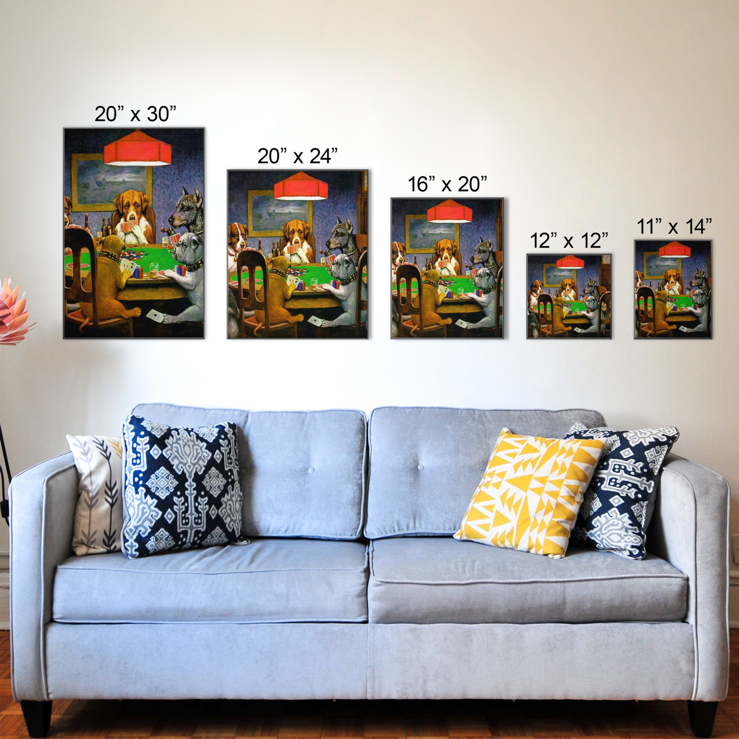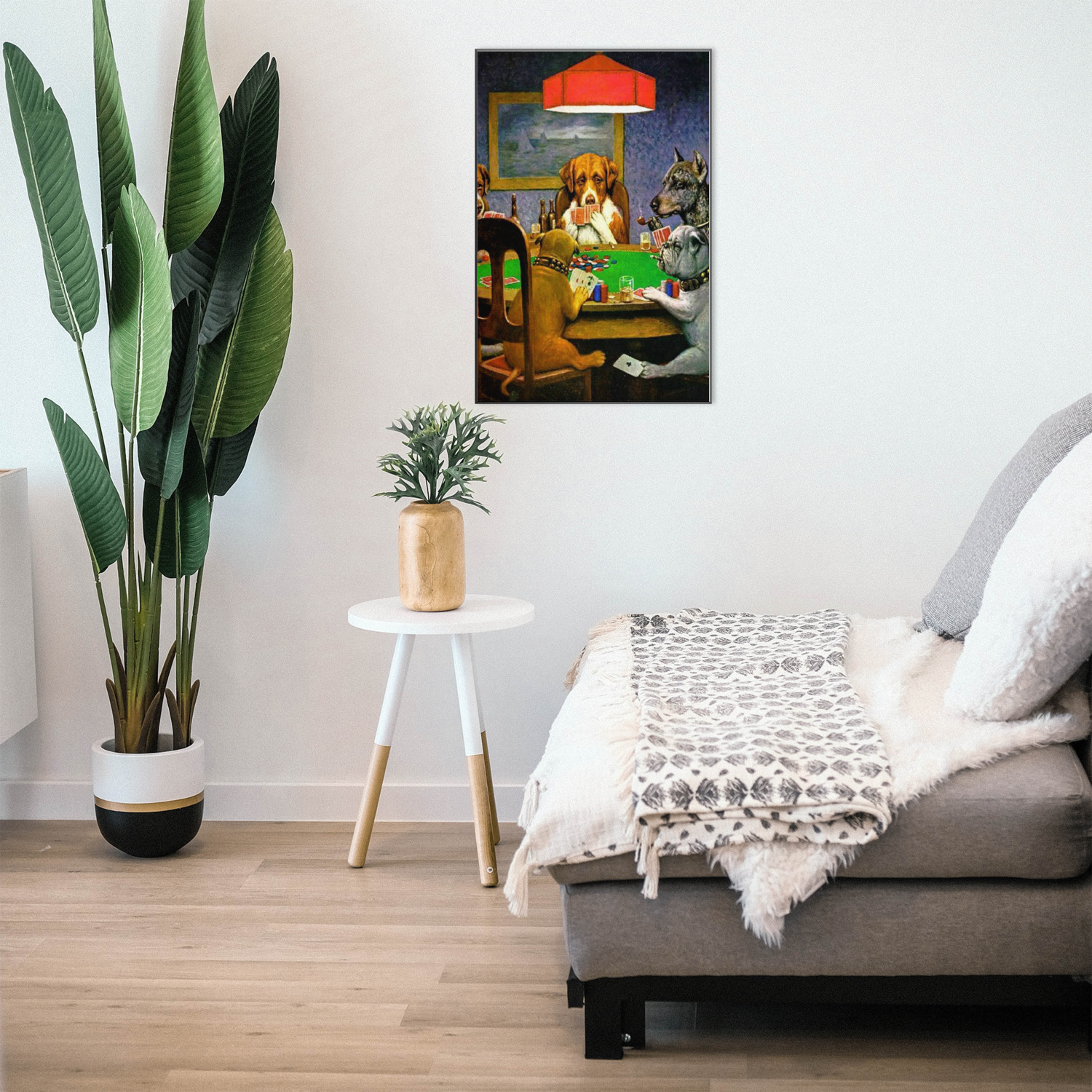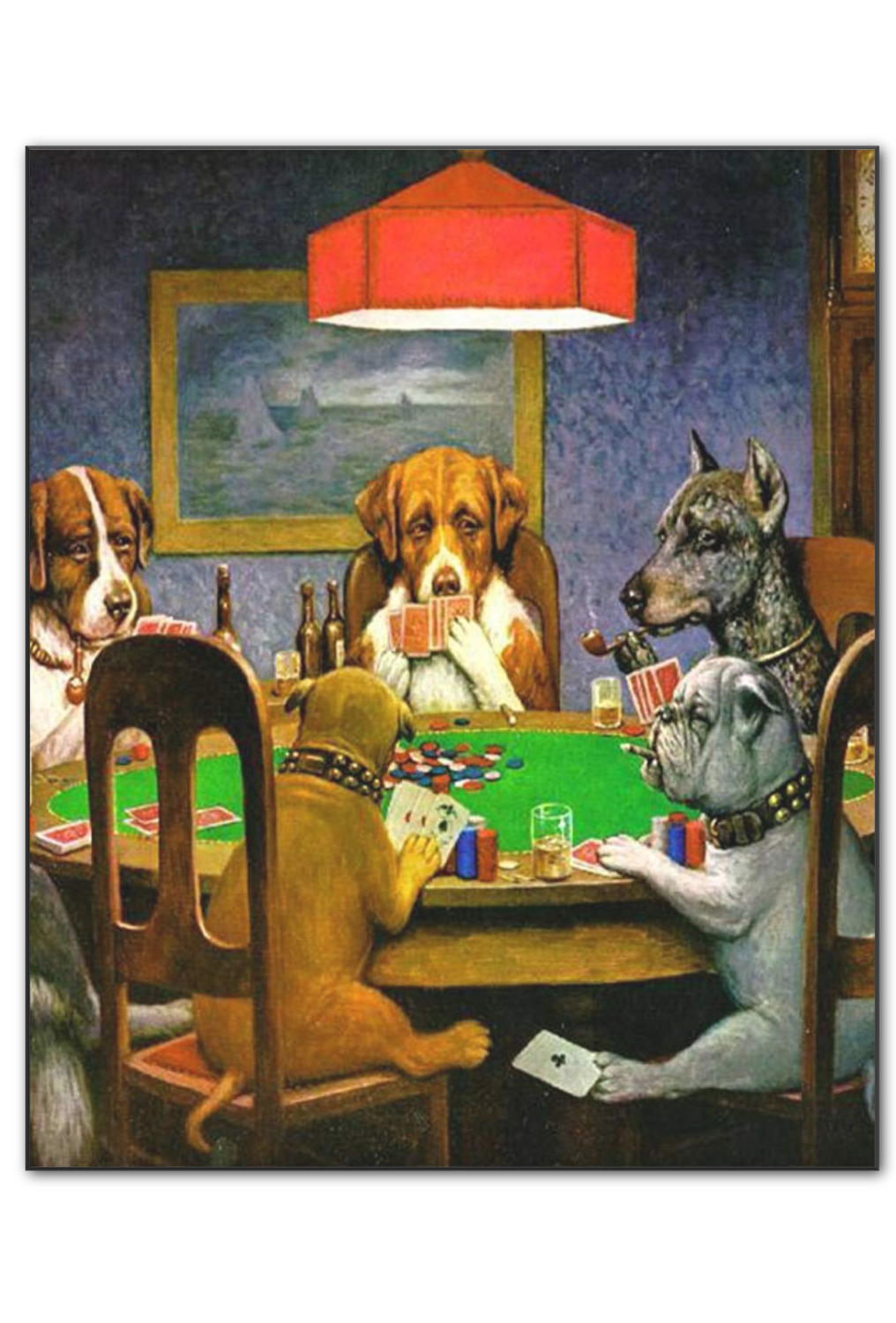 Dogs Playing Poker refers collectively to an 1894 painting, a series of sixteen oil paintings, and a 1910 painting by Cassius Marcellus Coolidge. Brown & Bigelow commissioned the 16 painting series in 1903 to advertise cigars. All eighteen paintings in the series feature personified dogs, but the eleven in which dogs are seated around a card table have become well known in the United States as examples of Kitsch art in home decoration. Source: Wikipedia