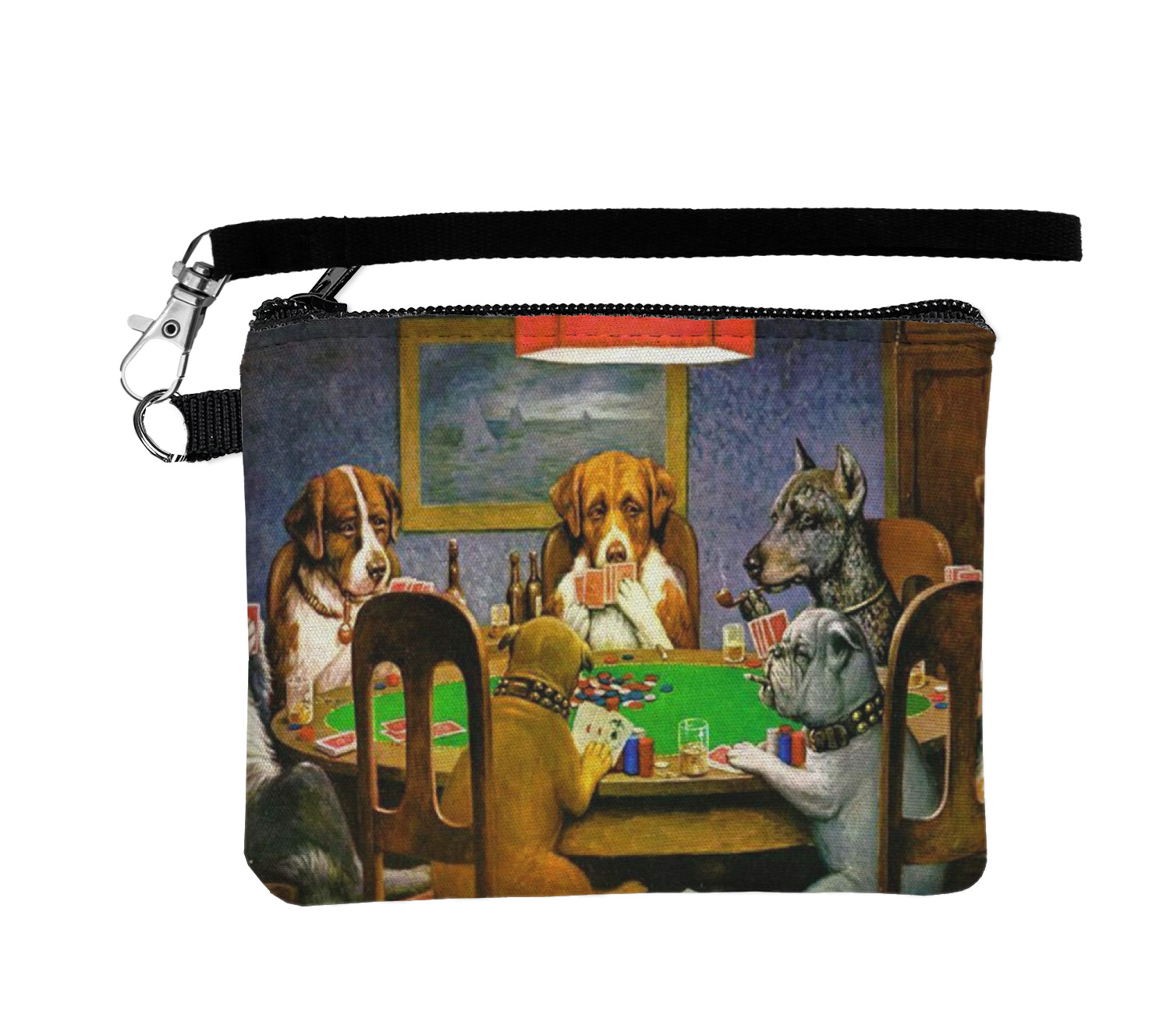 Dogs Playing Poker refers collectively to an 1894 painting, a series of sixteen oil paintings, and a 1910 painting by Cassius Marcellus Coolidge. Brown & Bigelow commissioned the 16 painting series in 1903 to advertise cigars. All eighteen paintings in the series feature personified dogs, but the eleven in which dogs are seated around a card table have become well known in the United States as examples of Kitsch art in home decoration. Source: Wikipedia