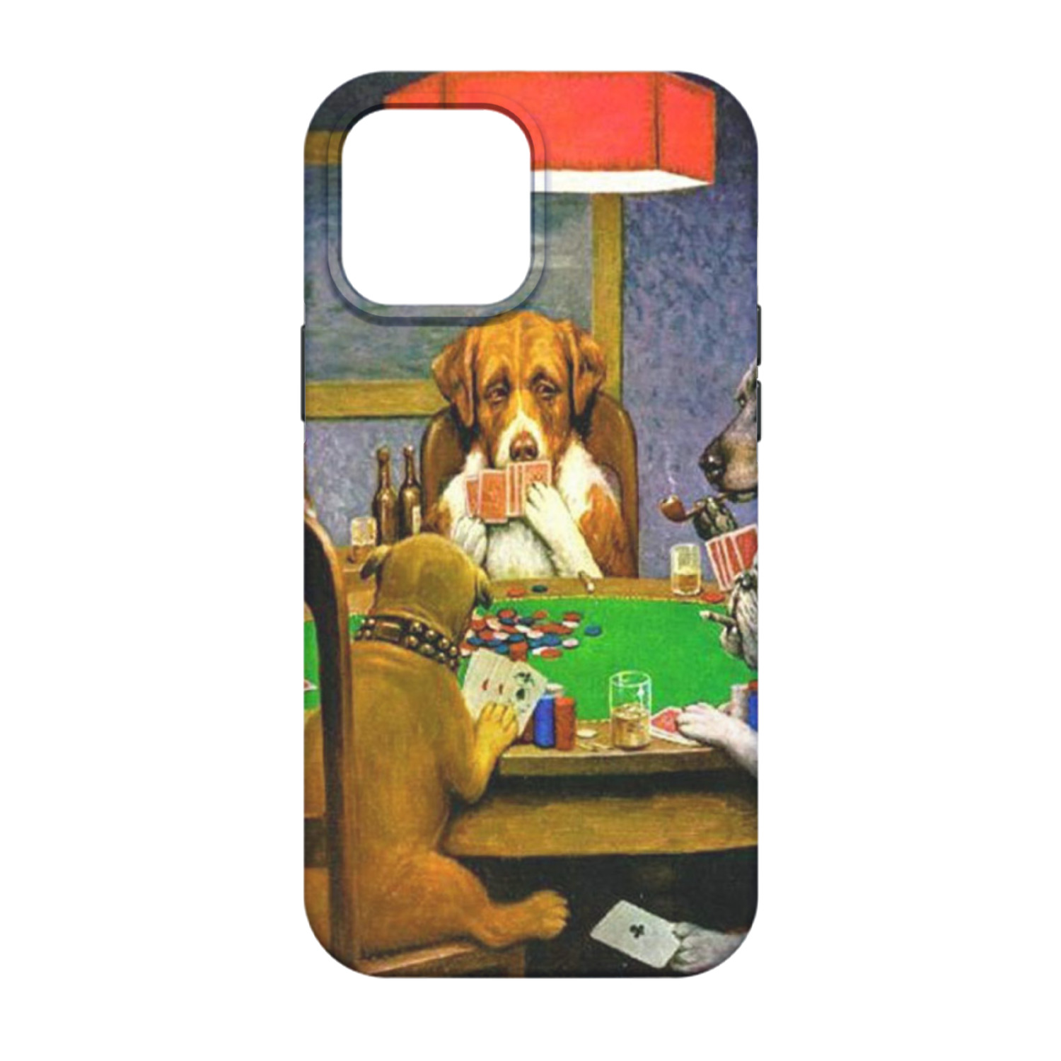 Dogs Playing Poker refers collectively to an 1894 painting, a series of sixteen oil paintings, and a 1910 painting by Cassius Marcellus Coolidge. Brown & Bigelow commissioned the 16 painting series in 1903 to advertise cigars. All eighteen paintings in the series feature personified dogs, but the eleven in which dogs are seated around a card table have become well known in the United States as examples of Kitsch art in home decoration. Source: Wikipedia
