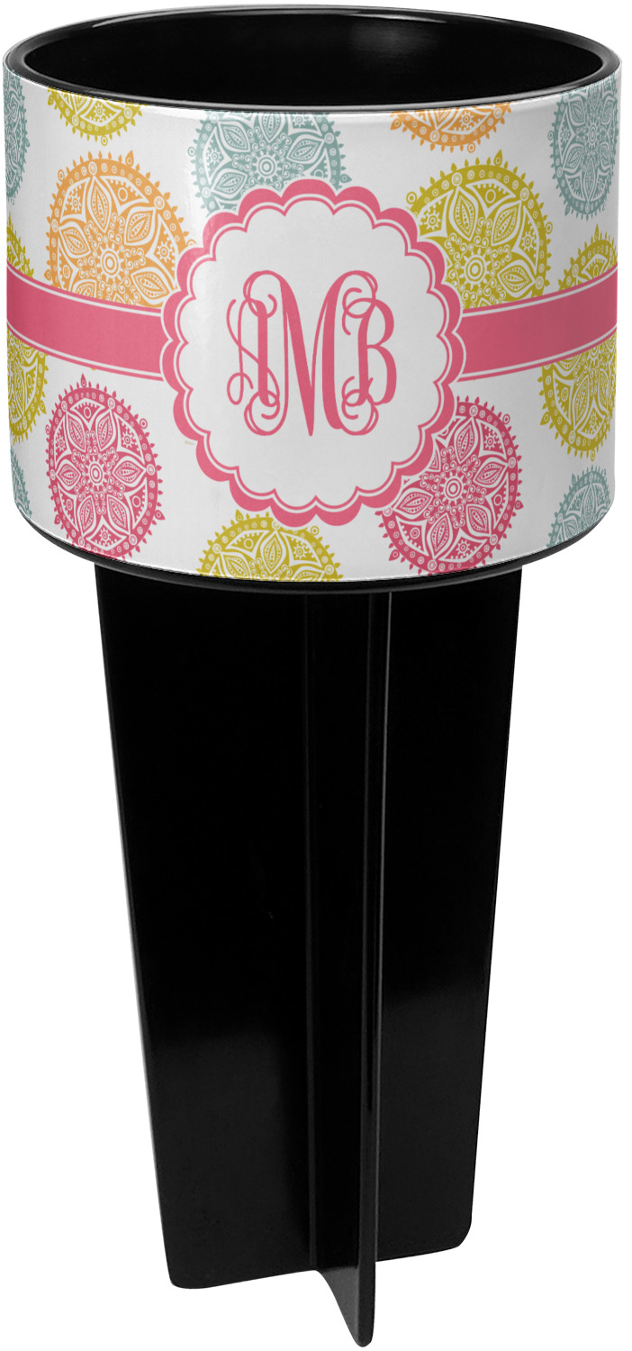 This cup holder has a large stake at its bottom that anchors it to the sand or ground below, while the cup holder rests above the stake. The entire drink holder is made of durable plastic and displays your customization around the cup holder portion. We sell these personalized beach spikers in two different colors: black and white.