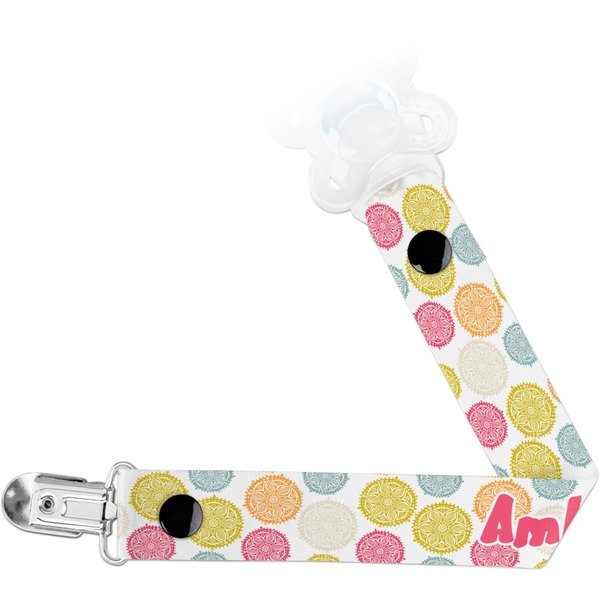 This personalized pacifier clip is the ideal size and measures at approximately 7.5 inches in length, when either end is snapped closed. On one end, you'll find a snap button. This button of your baby's pacifier holder is what can be attached to their pacifier to hold is securely in place. Simply open the snap, slip it through the pacifier opening, and snap it back into place. On the opposite end of this baby pacifier holder, you'll find a metal clip that can secure to a baby's collar or sleeve. This clip ensures that the strap stays in place, and that your baby's pacifier is always on hand.