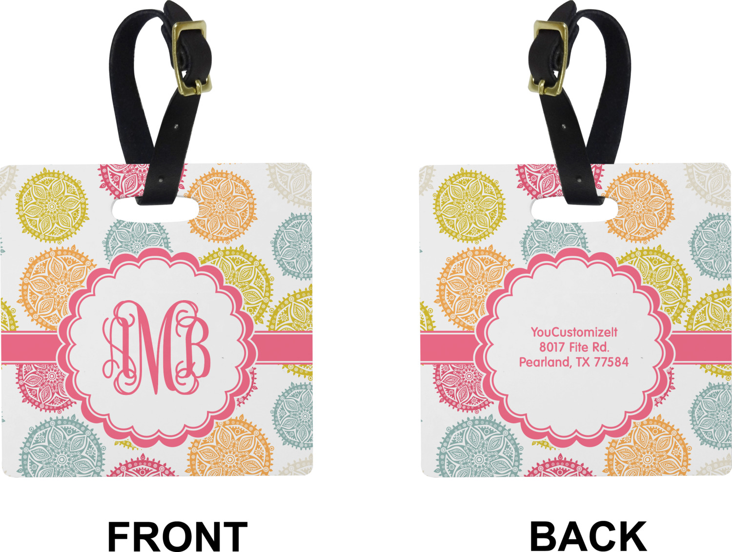 These personalized bag tags are sold in a variety of shapes, so that you may find the product that meets your vision exactly. We sell a round luggage tag, which measures at approximately 4" x 4". Our square luggage tag is about 3.5" x 3.5", while our rectangular version is 2.75" x 4 ".