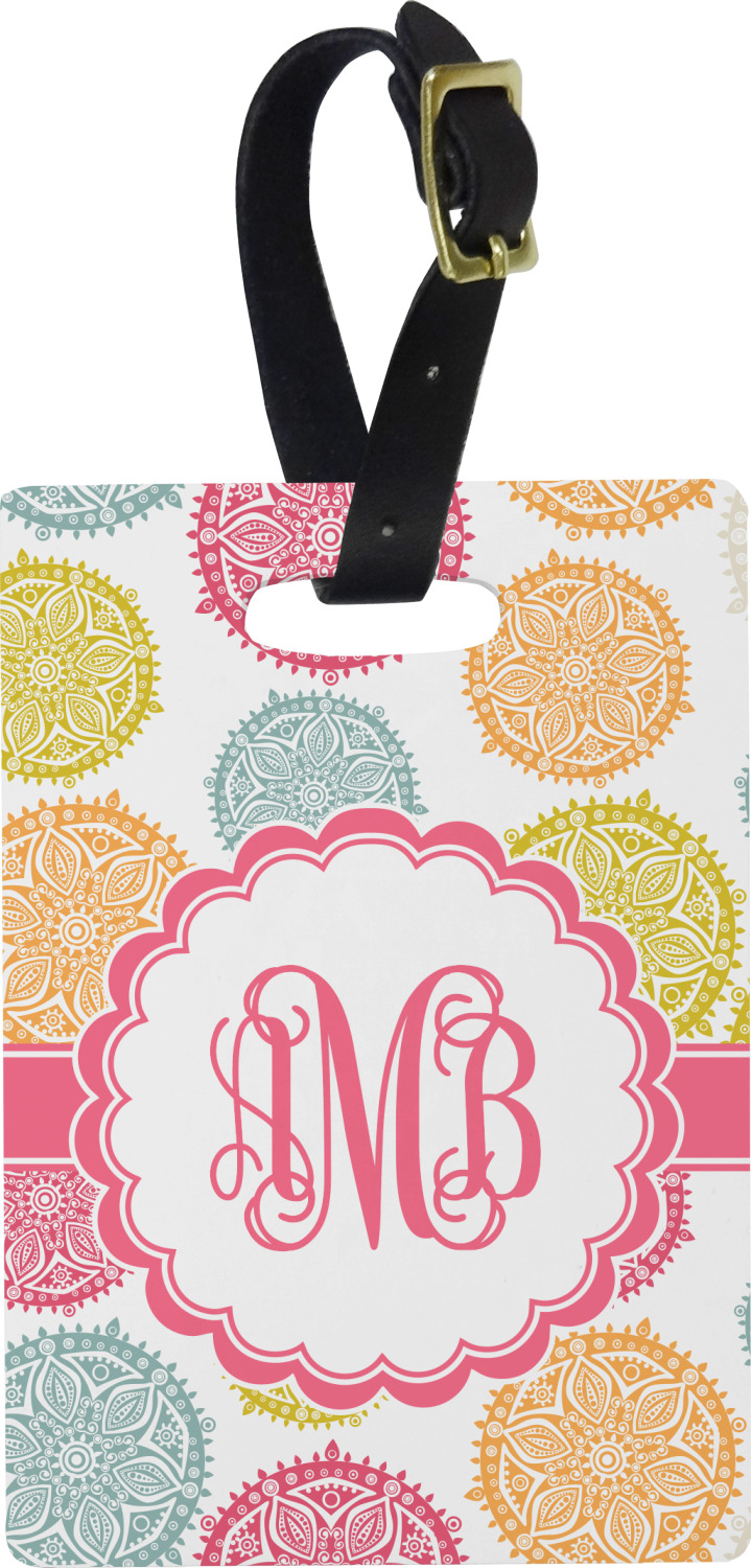 These personalized bag tags are sold in a variety of shapes, so that you may find the product that meets your vision exactly. We sell a round luggage tag, which measures at approximately 4" x 4". Our square luggage tag is about 3.5" x 3.5", while our rectangular version is 2.75" x 4 ".