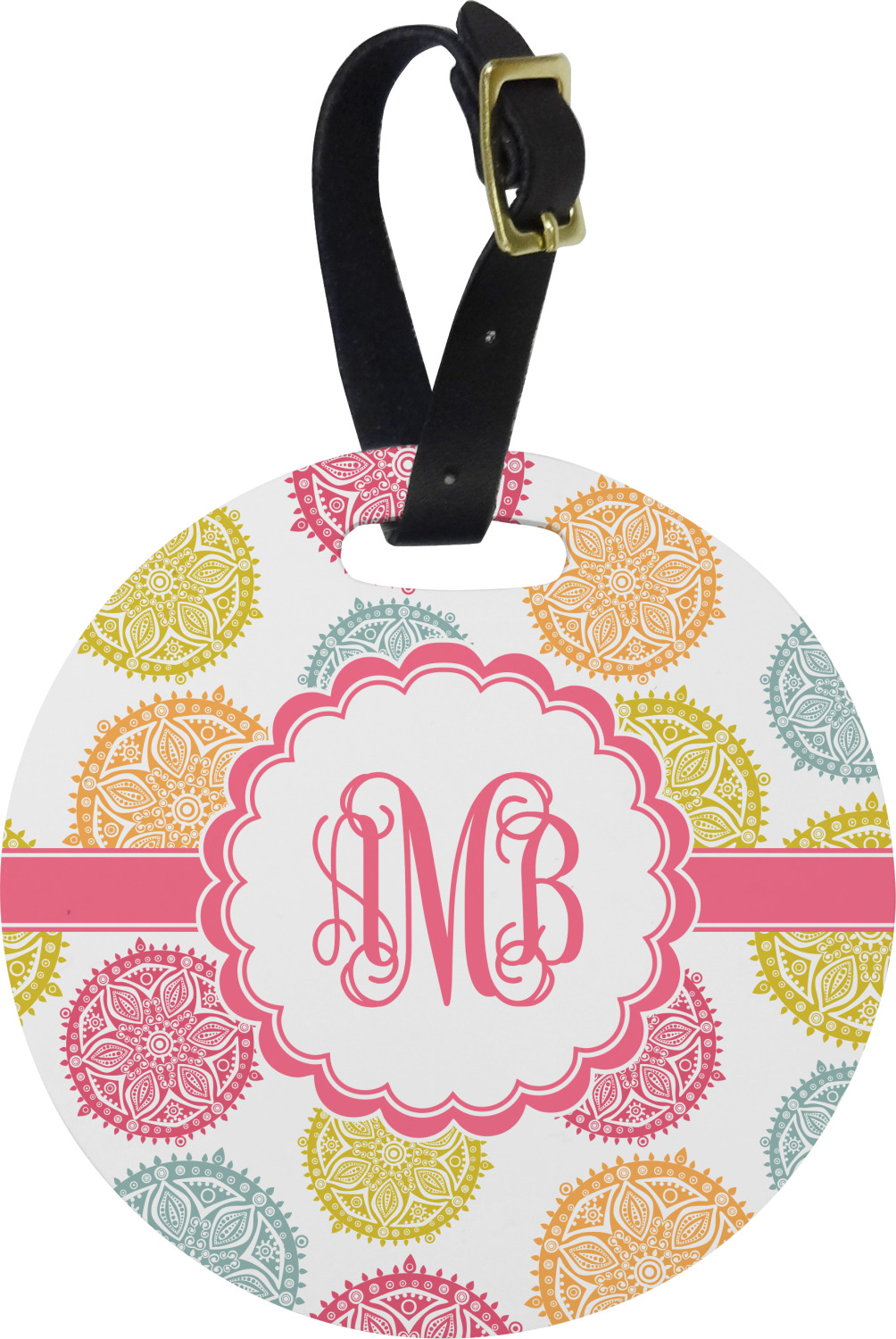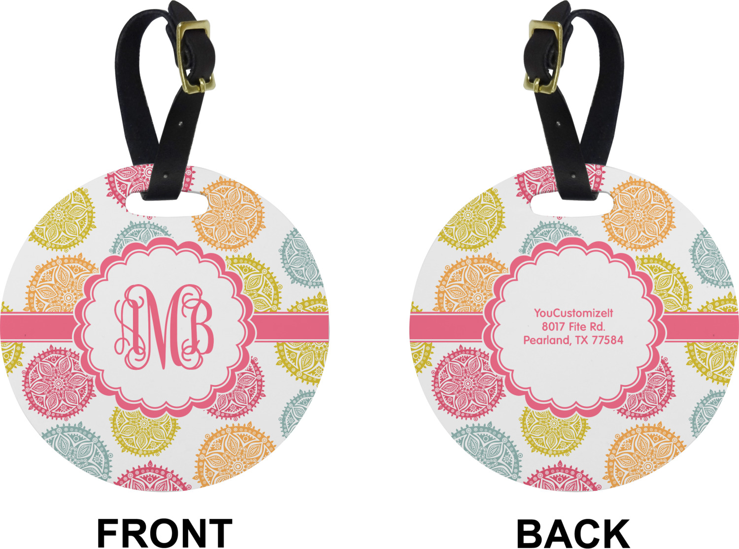 These personalized bag tags are sold in a variety of shapes, so that you may find the product that meets your vision exactly. We sell a round luggage tag, which measures at approximately 4" x 4". Our square luggage tag is about 3.5" x 3.5", while our rectangular version is 2.75" x 4 ".