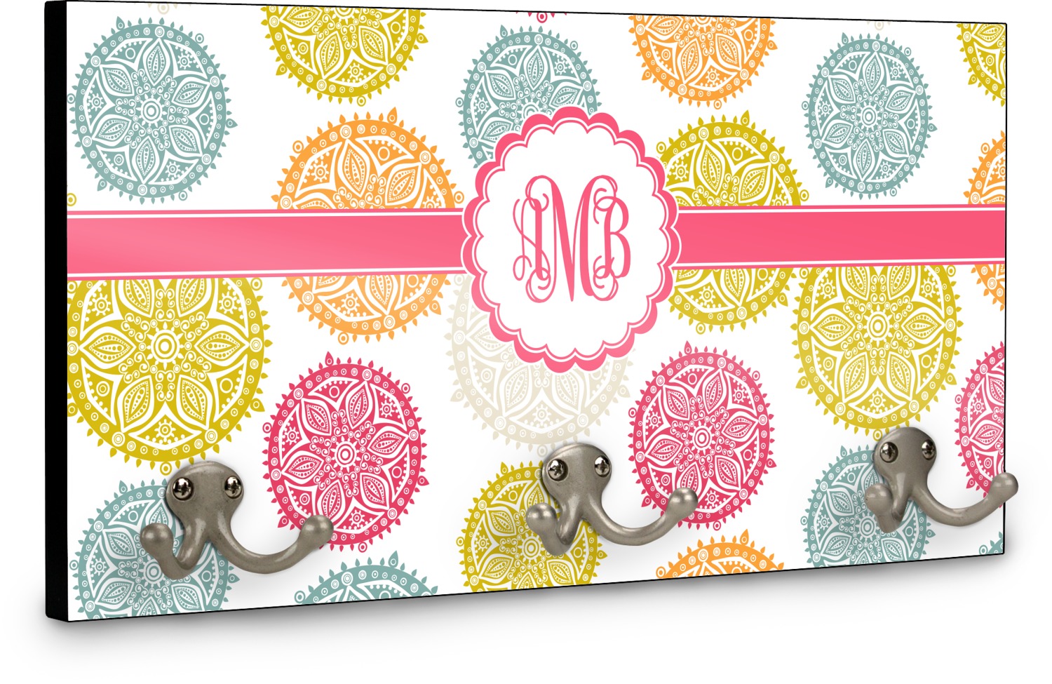 This coat rack is the perfect way to add some personality to your wall or entryway. The board is made of a strong maple that is approximately 16" x 8". The three 2-prong hooks are a sturdy metal that have three screws attaching them to the board. Your design is printed right onto the front of the board while the back and sides are a simple black.