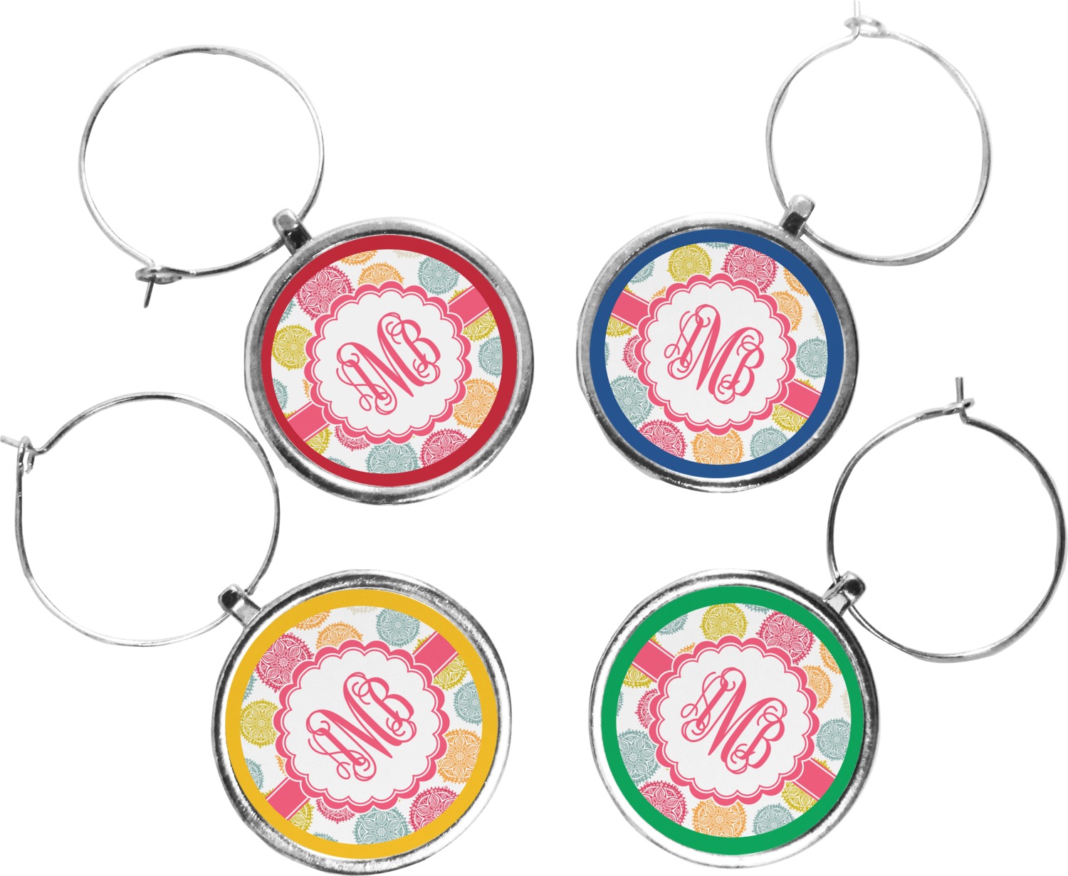 Your wine glass markers are comprised of a circular zinc plate with a 1.25 inch diameter. The zinc plate hangs from a zinc loop, which can be easily secured and removed from the stem of a wine glass. Your customized design is printed onto a 1 inch diameter insert, and then placed into the wine glass charm itself. Though sold in a set of four, you can personalize each charm individually and change the colors of the ring around your design, depending on your needs.