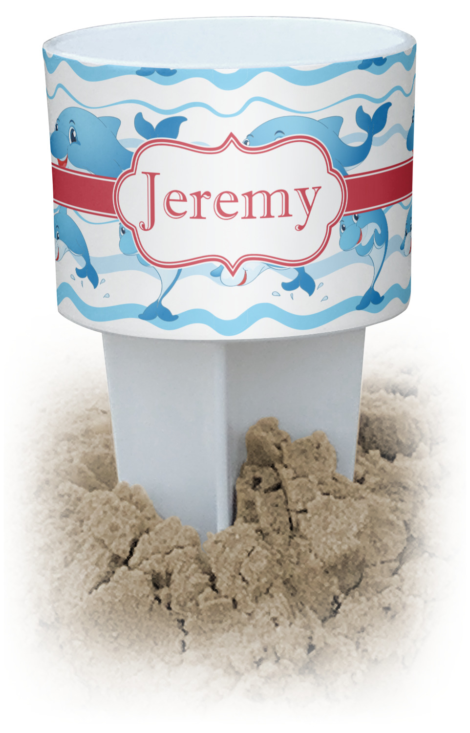 This cup holder has a large stake at its bottom that anchors it to the sand or ground below, while the cup holder rests above the stake. The entire drink holder is made of durable plastic and displays your customization around the cup holder portion. We sell these personalized beach spikers in two different colors: black and white.
