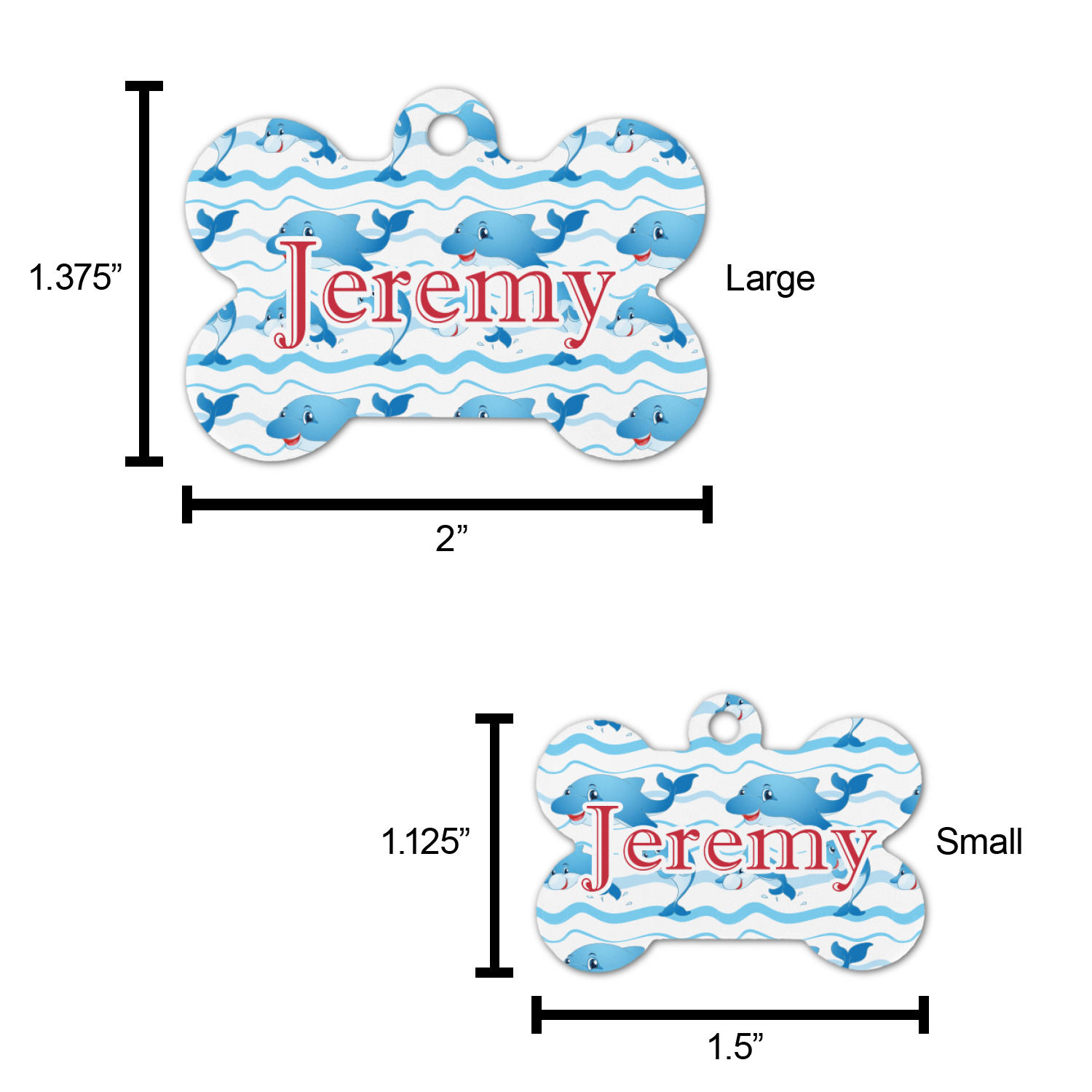 The small bone dog tag size is perfect to pair with our small dog collars, the large size pairs well with our large dog collars.