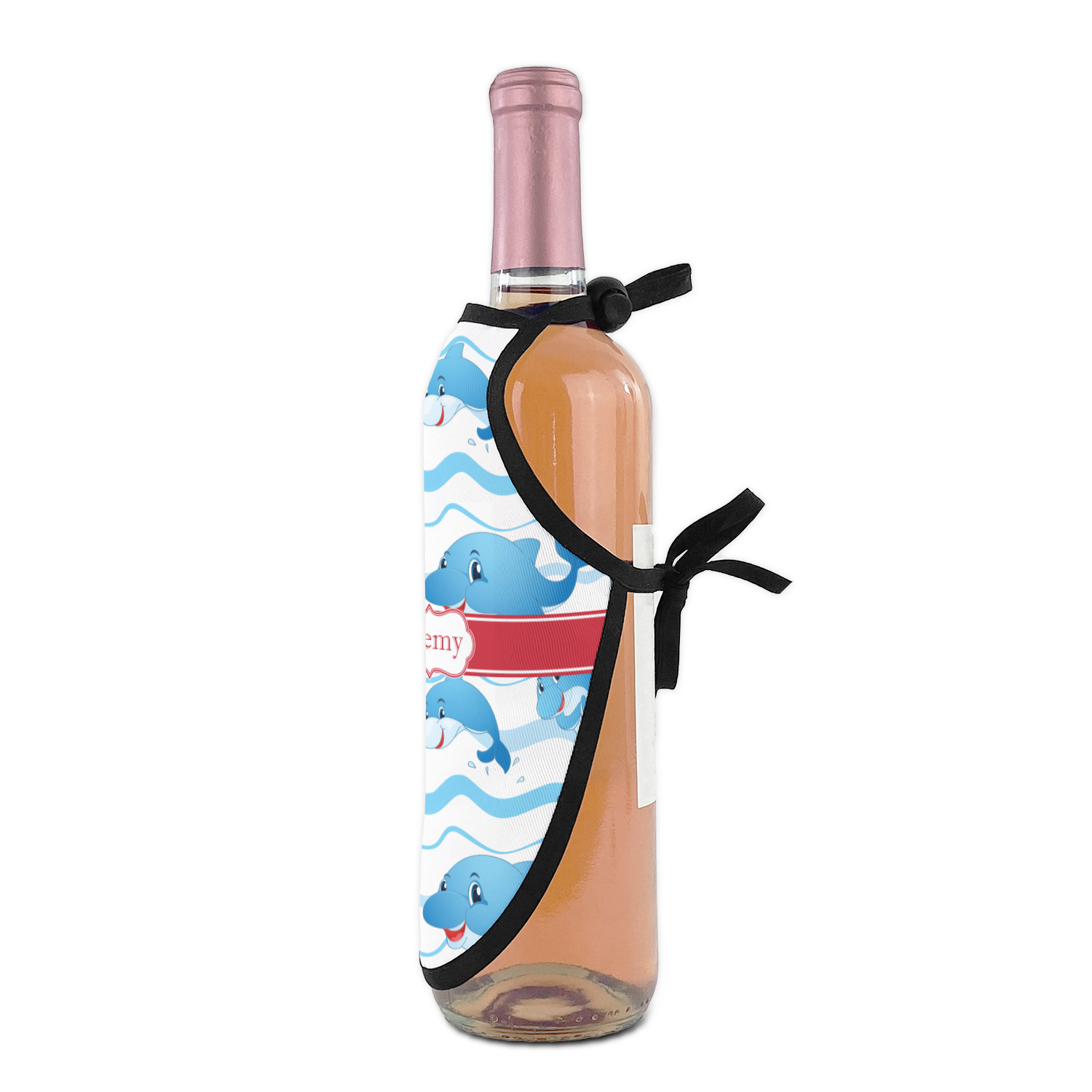 Made from a polyester fabric with black trim and tie string, these bottle aprons fit most large sized bottles including wine bottles, liquor bottles and dish soap bottles. With an included sliding cord lock the neck is adjustable to make these be a universal fit for most any sized bottle. The printed space of the apron measures approximately 8.5" tall and at its widest point the printed area is 6" wide.