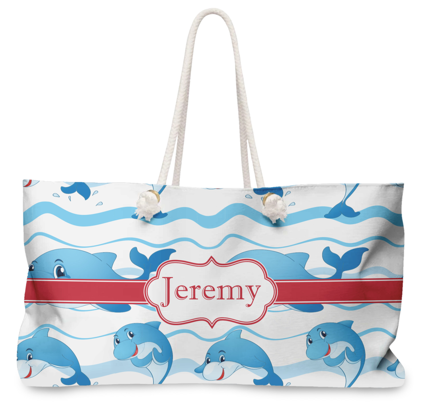 Our oversized weekender tote with rope handles is perfect for your weekend at the beach or on the town. This large tote are 24" W X 13" H, with a 5" gusset and a 27" thick rope handles with a knot that is put through a grommeted brass hole.