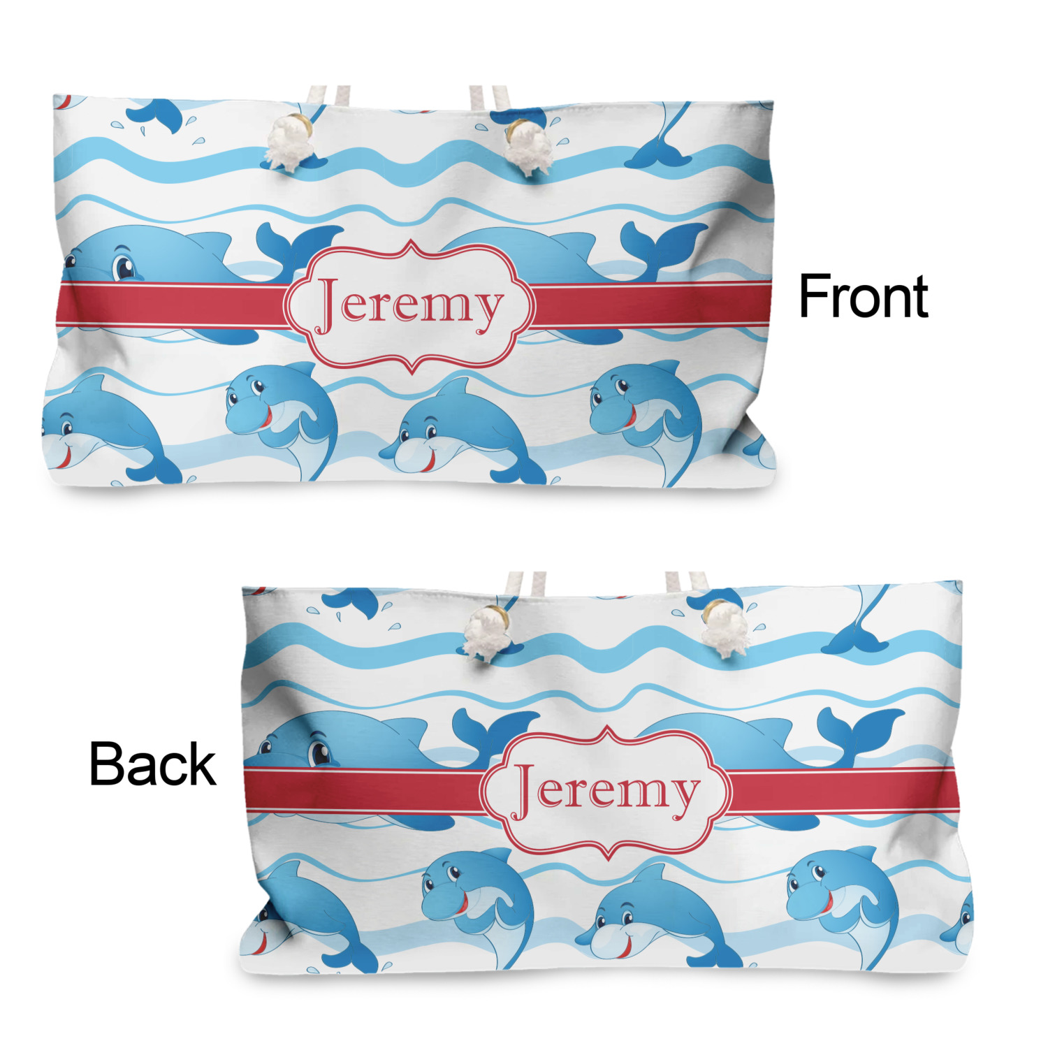 These large totes are handmade i.e. printed, cut and sewn right here in the USA. The canvas like material is printed using dye sublimation; the fabric is then cut and sewn along with a beautiful cream colored lining (to match the rope handles). The brass grommets are then added and the cream colored rope if fed through the grommets and knotted.