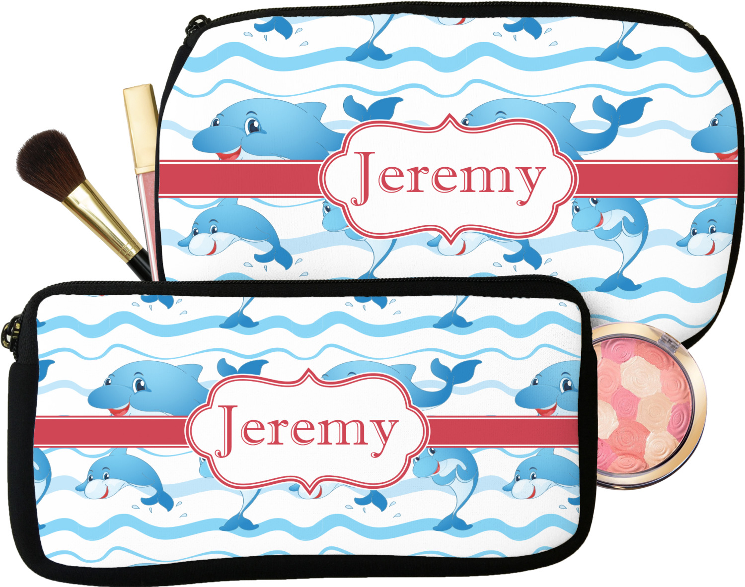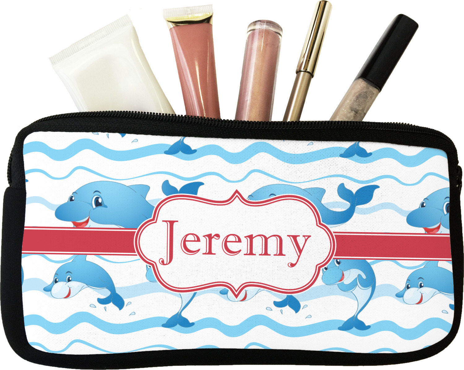 Our personalized makeup bags are available in many different designs, patterns and colors - so you are sure to find one that will love. They are made of neoprene (same material as wet-suits) and thus are water resistant, so spillages in your makeup bag will not end up all over you purse. They are customized on one side and are black on the other side and the zipper is black as well.