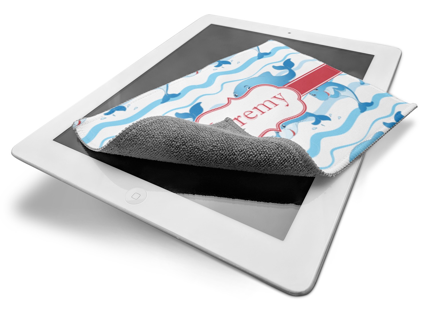 The back of this cleaning cloth is made from a gentle, grey microfiber material, that is masterful at removing smudges, grease, and fingerprints from lenses or electronic screens. The front side of the screen cleaner displays your personalized design in vibrant color. A beautiful stitch lines the edges and secures the microfiber to the polyester top. We provide you with the option of customizing this screen horizontally or vertically, depending on your preferences.
