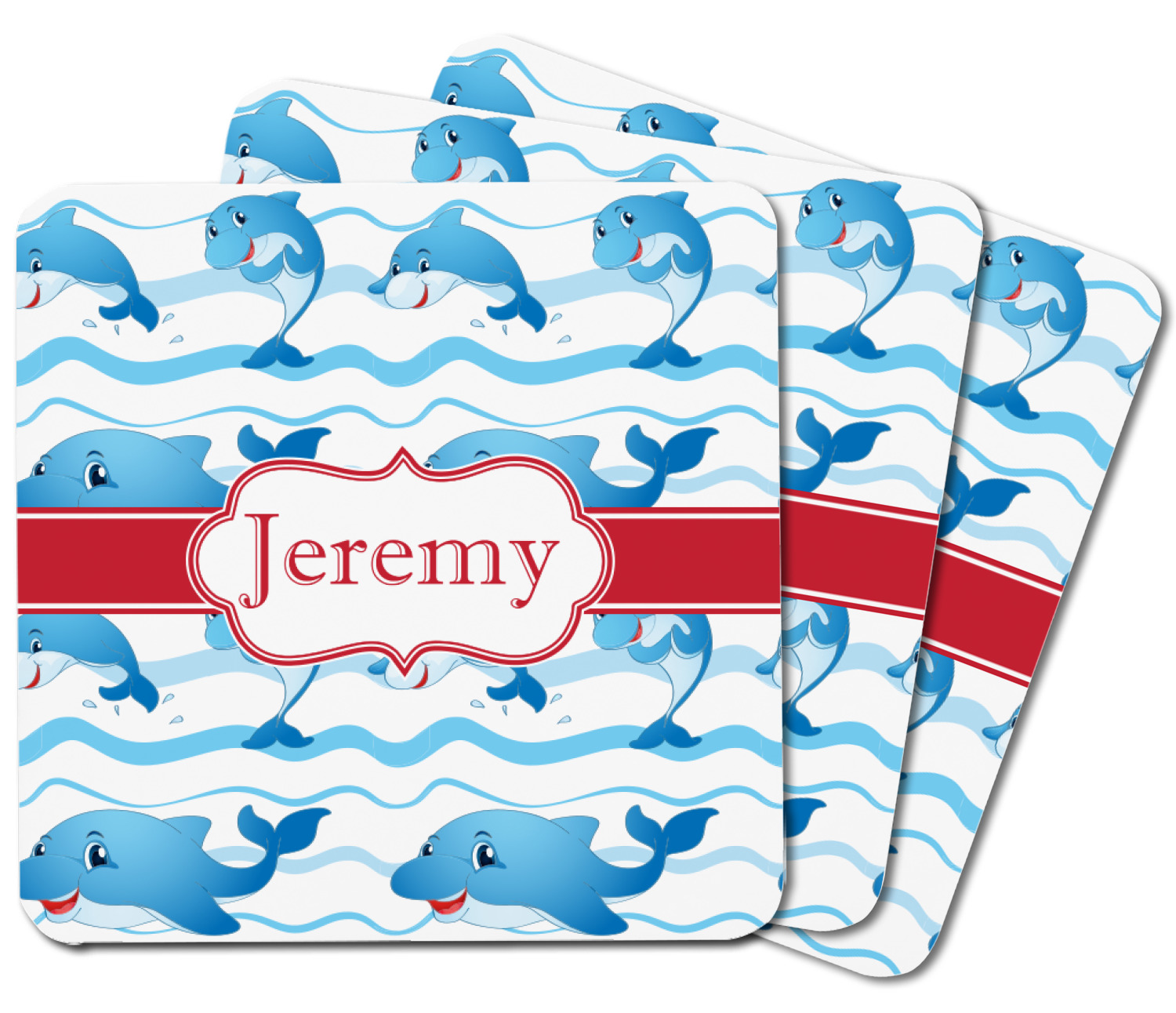 Who doesn't get excited when they see dolphins on the horizons? This design features a bunch of cute, smiling dolphins as they splash through the sea. Use to reminiscence a much missed vacation, or even just to spice up a boring summer day. Personalize by adding your kid's name!