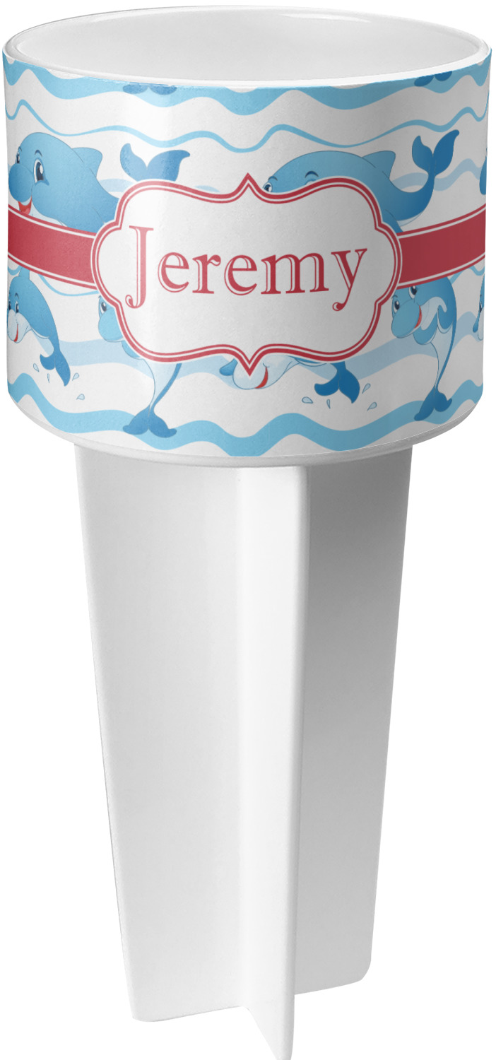 This cup holder has a large stake at its bottom that anchors it to the sand or ground below, while the cup holder rests above the stake. The entire drink holder is made of durable plastic and displays your customization around the cup holder portion. We sell these personalized beach spikers in two different colors: black and white.