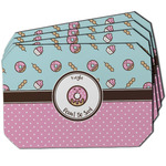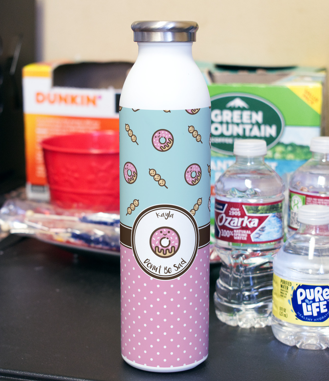 This design is a beautiful light blue/teal and light pink. The top half of the design has a fun pattern with a blue/teal background and pink donuts and other treats. The bottom half is a bright pink polka dot pattern. Each background is divided by a dark brown ribbon. On top of these is a round label with an adorable donut and your personalization right in the middle.