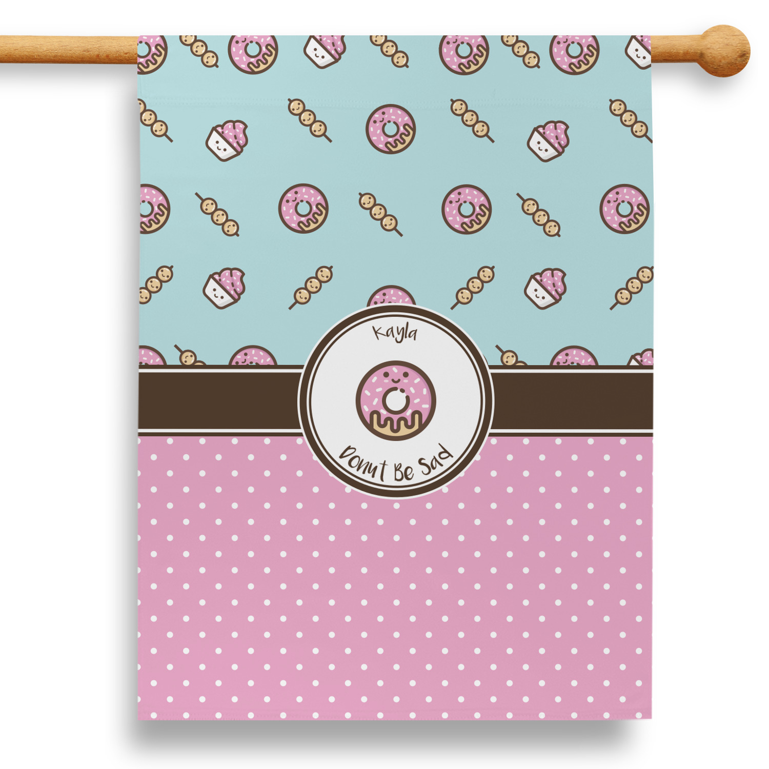 This design is a beautiful light blue/teal and light pink. The top half of the design has a fun pattern with a blue/teal background and pink donuts and other treats. The bottom half is a bright pink polka dot pattern. Each background is divided by a dark brown ribbon. On top of these is a round label with an adorable donut and your personalization right in the middle.
