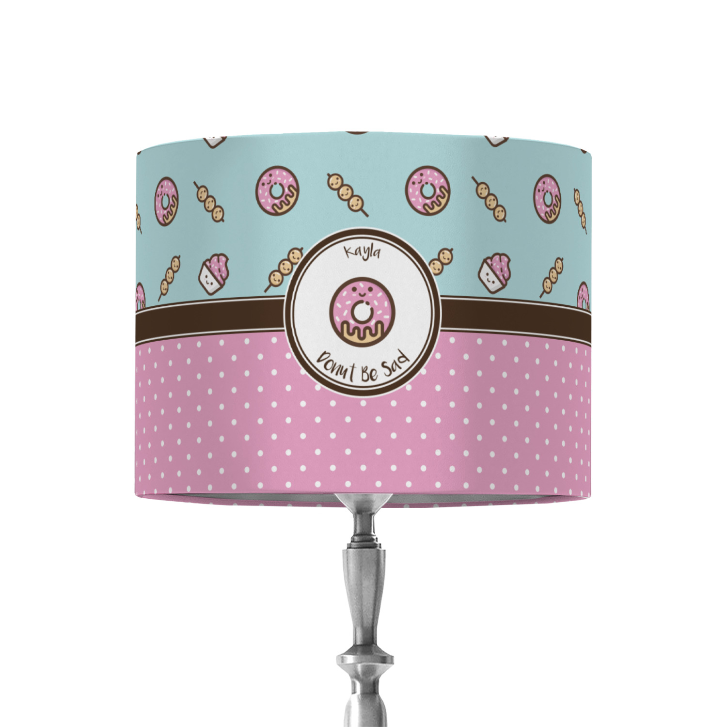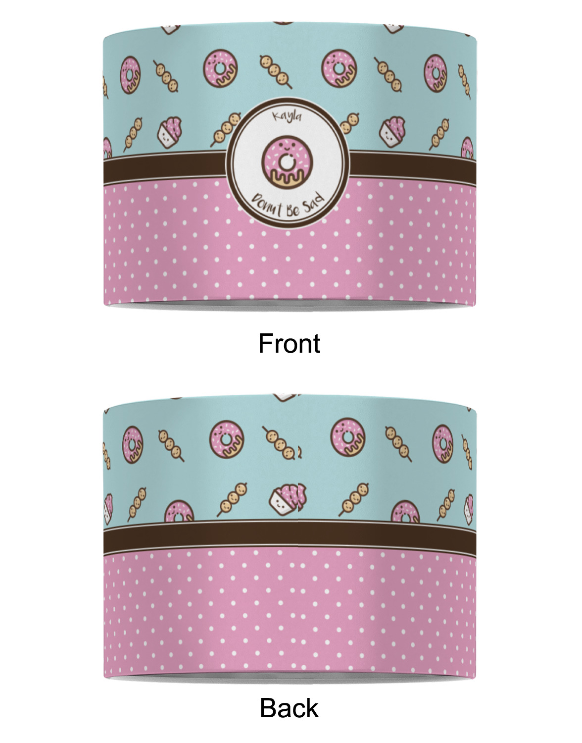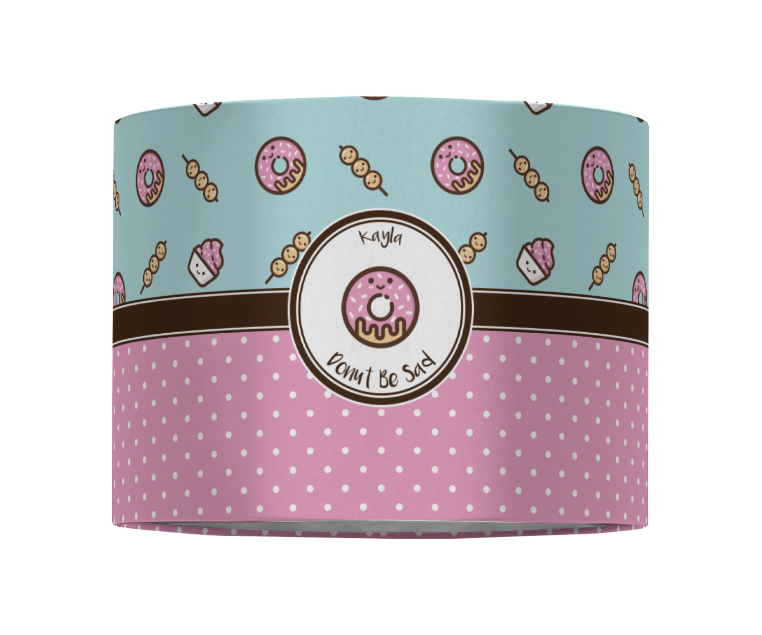 This design is a beautiful light blue/teal and light pink. The top half of the design has a fun pattern with a blue/teal background and pink donuts and other treats. The bottom half is a bright pink polka dot pattern. Each background is divided by a dark brown ribbon. On top of these is a round label with an adorable donut and your personalization right in the middle.