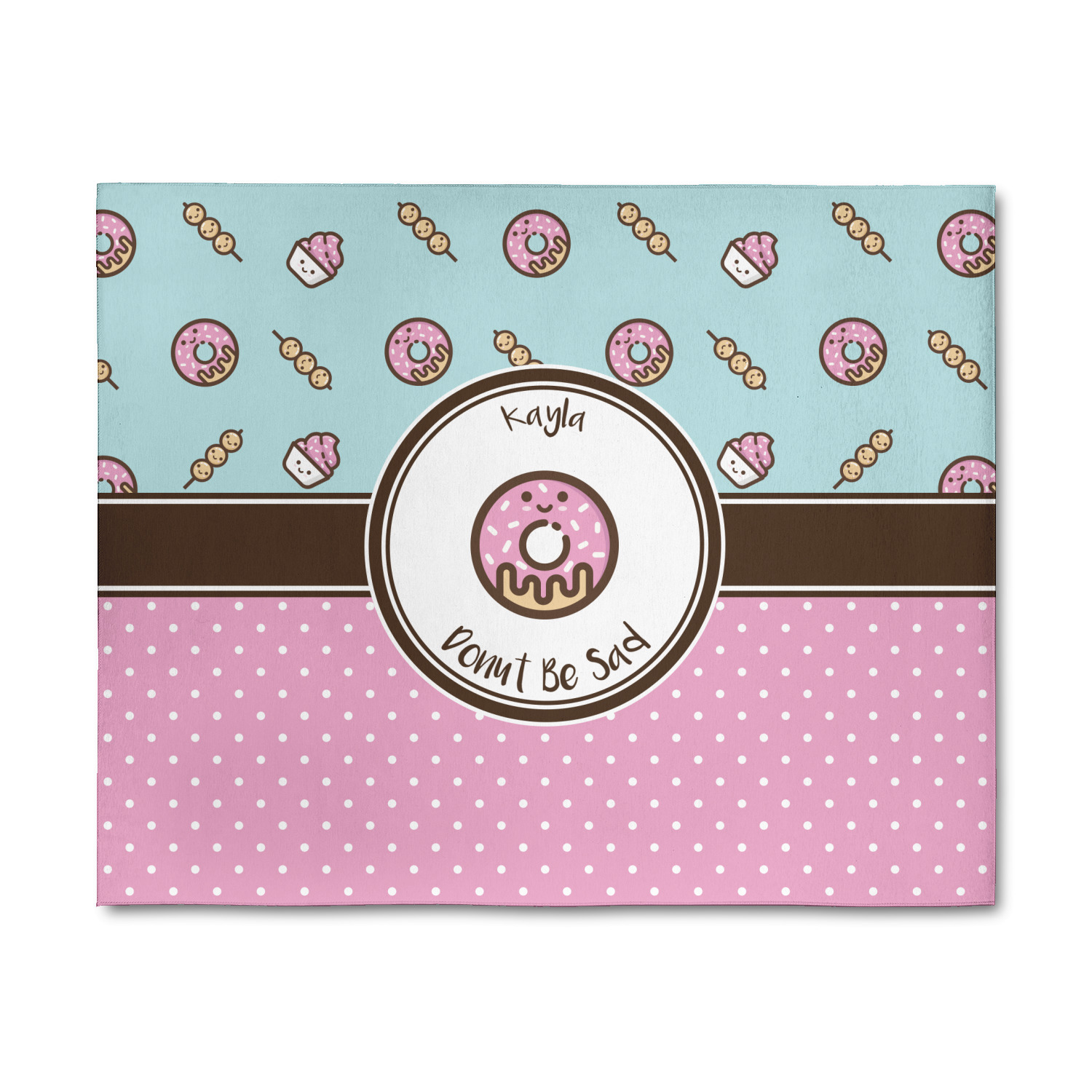 This design is a beautiful light blue/teal and light pink. The top half of the design has a fun pattern with a blue/teal background and pink donuts and other treats. The bottom half is a bright pink polka dot pattern. Each background is divided by a dark brown ribbon. On top of these is a round label with an adorable donut and your personalization right in the middle.
