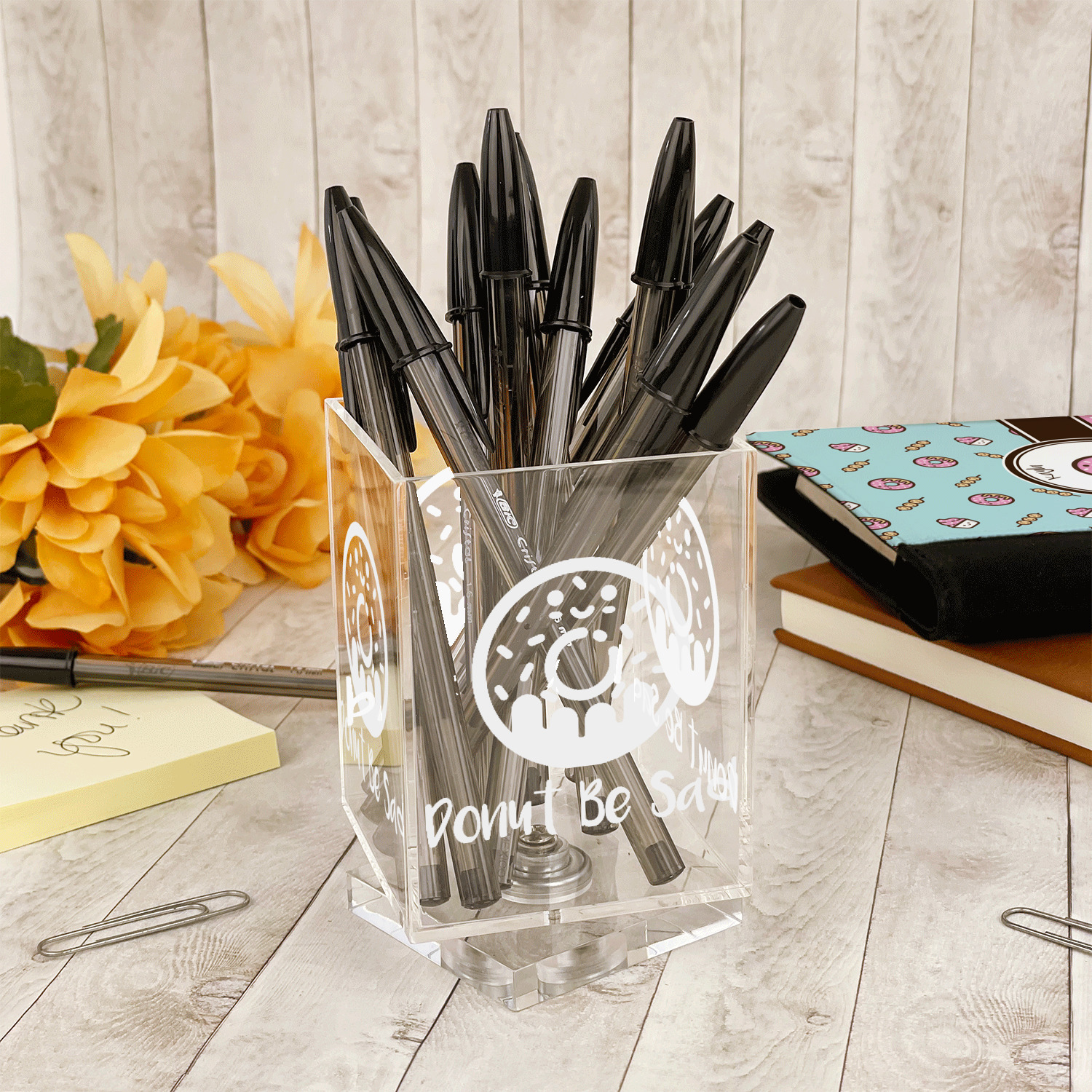 Add a great accessory to your desk with one of these acrylic pen holders. A great way to store your writing utensils, and personalized to suit your needs.