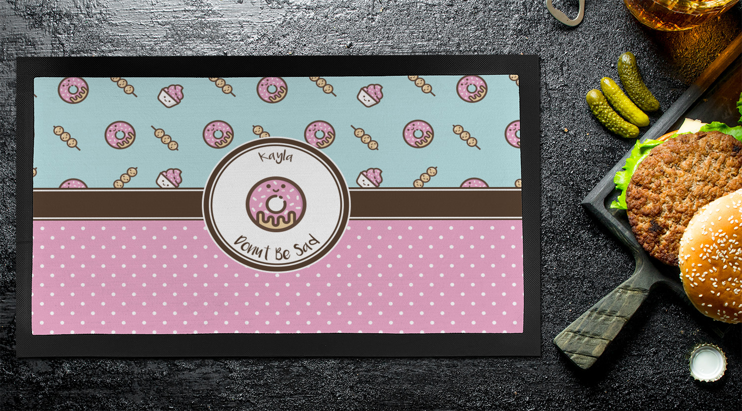 This design is a beautiful light blue/teal and light pink. The top half of the design has a fun pattern with a blue/teal background and pink donuts and other treats. The bottom half is a bright pink polka dot pattern. Each background is divided by a dark brown ribbon. On top of these is a round label with an adorable donut and your personalization right in the middle.