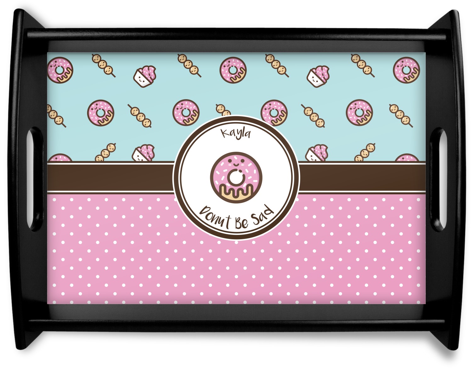 This serving tray with handles features square edges and two rounded sides, creating a very modern look. Each side is fabricated from a beautifully cut, natural wood. The bottom of the interior of the tray displays your customized design in bright, vibrant color. The tray is sold in both a black color and a natural wood look. Each variation of the wood serving tray has two sizes: Small, which is 14" x 10" x 2.25", and Large, which is 19.5" x 13.5" x 2.75".