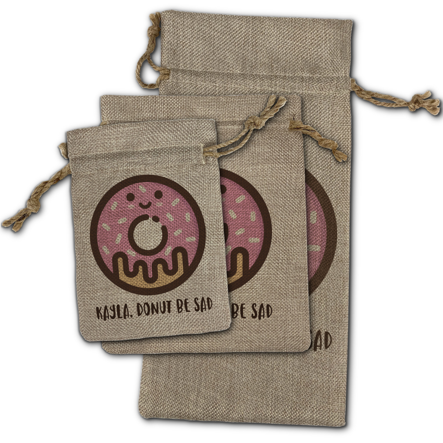 We sell our Burlap Gift Bags in 3 variant sized bags. Made with burlap polyester, each personalized bag can be secured with a twine drawstring pull. Your custom design is available to print on one side or both sides - completely up to you! The sizes of the bags measure approximately 4.5" x 6.5" for the smallest size, 6.5" x 8.0" for the medium size, and 6.5" x 13.5" for the large-sized bag.