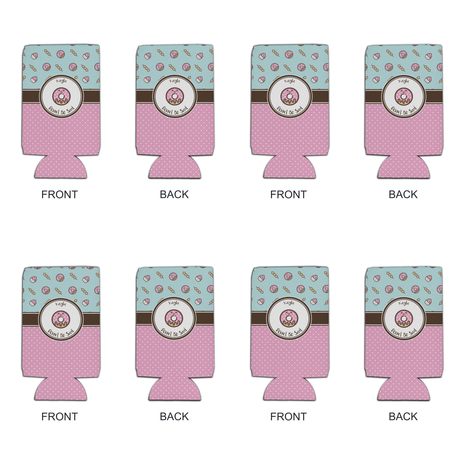 This design is a beautiful light blue/teal and light pink. The top half of the design has a fun pattern with a blue/teal background and pink donuts and other treats. The bottom half is a bright pink polka dot pattern. Each background is divided by a dark brown ribbon. On top of these is a round label with an adorable donut and your personalization right in the middle.
