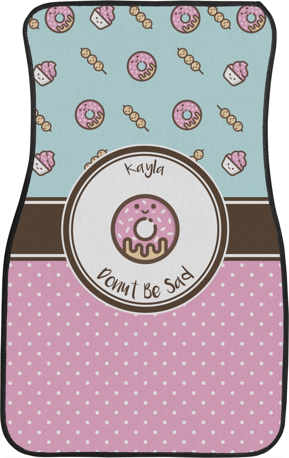 This design is a beautiful light blue/teal and light pink. The top half of the design has a fun pattern with a blue/teal background and pink donuts and other treats. The bottom half is a bright pink polka dot pattern. Each background is divided by a dark brown ribbon. On top of these is a round label with an adorable donut and your personalization right in the middle.