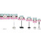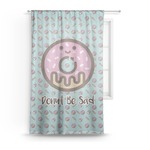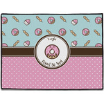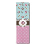 This design is a beautiful light blue/teal and light pink. The top half of the design has a fun pattern with a blue/teal background and pink donuts and other treats. The bottom half is a bright pink polka dot pattern. Each background is divided by a dark brown ribbon. On top of these is a round label with an adorable donut and your personalization right in the middle.
