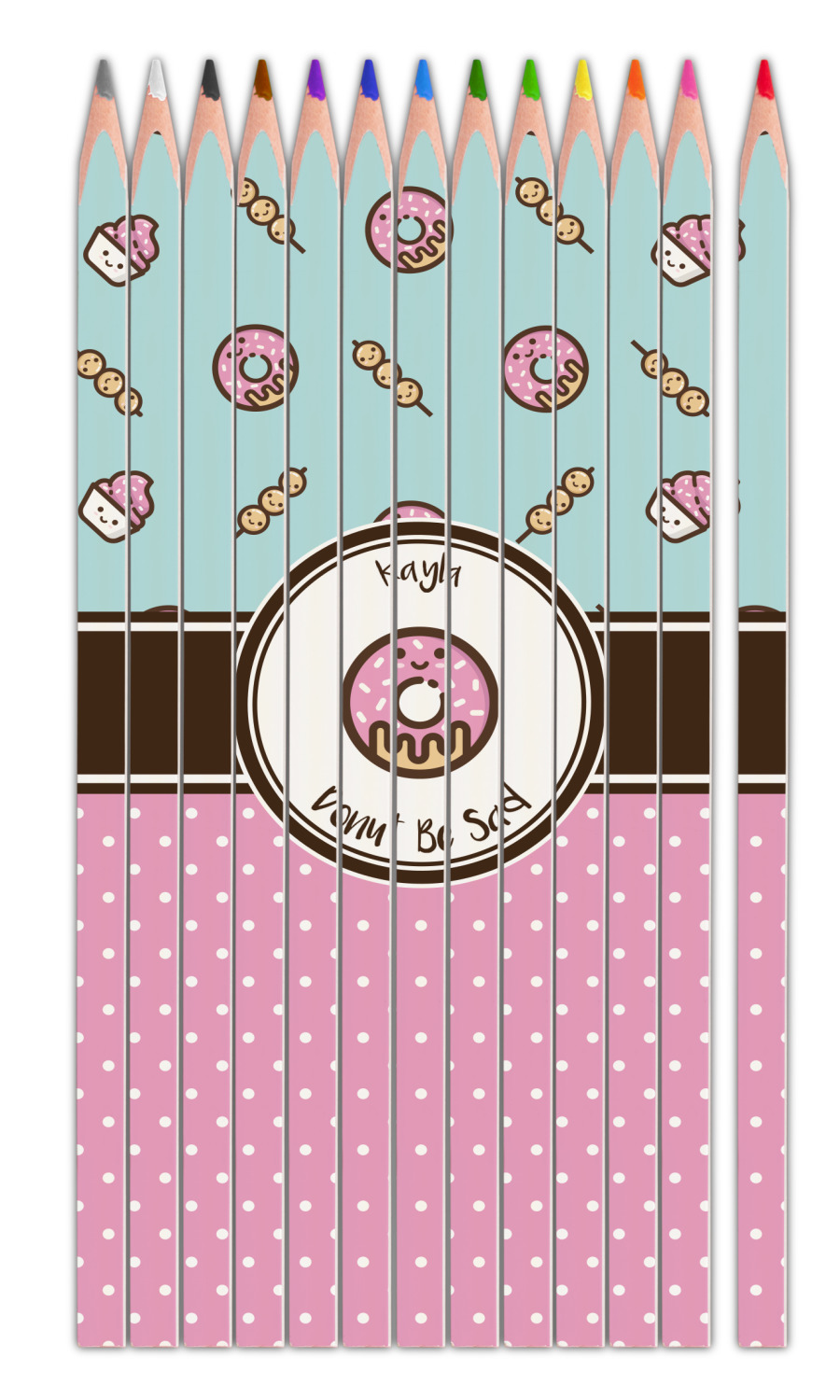This design is a beautiful light blue/teal and light pink. The top half of the design has a fun pattern with a blue/teal background and pink donuts and other treats. The bottom half is a bright pink polka dot pattern. Each background is divided by a dark brown ribbon. On top of these is a round label with an adorable donut and your personalization right in the middle.