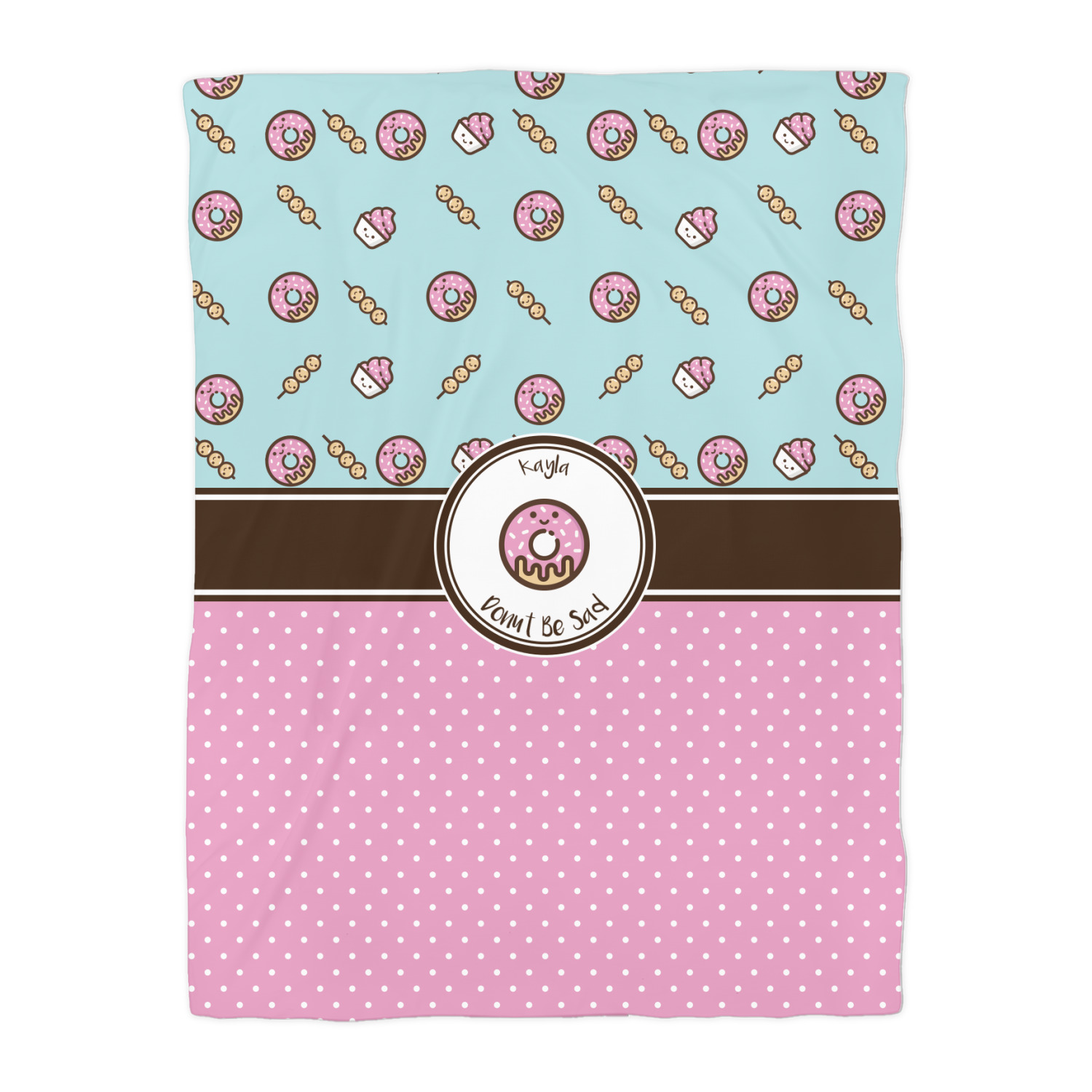 This design is a beautiful light blue/teal and light pink. The top half of the design has a fun pattern with a blue/teal background and pink donuts and other treats. The bottom half is a bright pink polka dot pattern. Each background is divided by a dark brown ribbon. On top of these is a round label with an adorable donut and your personalization right in the middle.