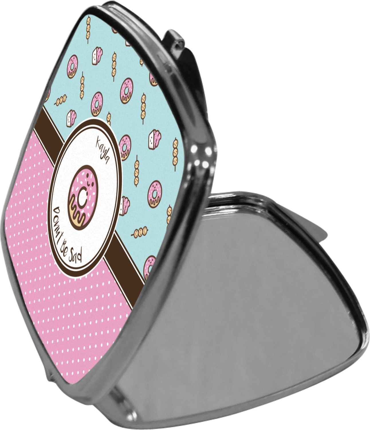 Our compact mirrors are customized with your design on one side. The other side is patterned silver tone metal. Inside, there are two mirrors.
