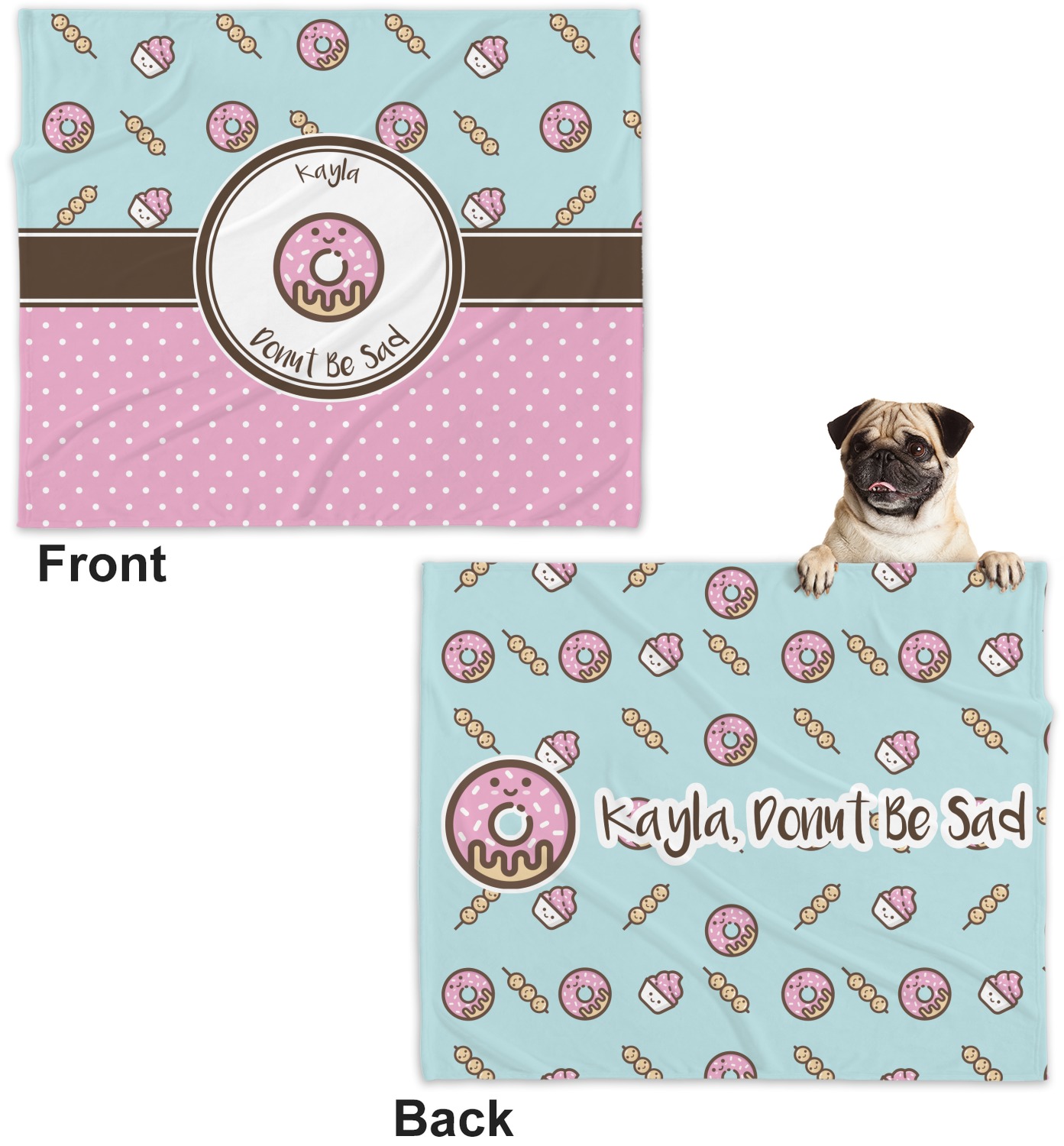 These dog blankets are crafted from a gentle, soft-to-the-touch, minky material. We print your customizations, either matching or differing, on both the top and underside of the blanket. These personalized dog blankets are available in two sizes: regular and large. Our regular size, at 40" x 30", accommodates small and some medium size dogs. At 60" x 50", our large dog blanket is a better fit for bigger breeds. Though specialized for dogs, these blankets still make a thoughtful gift for your favorite feline, or any other pet in mind!