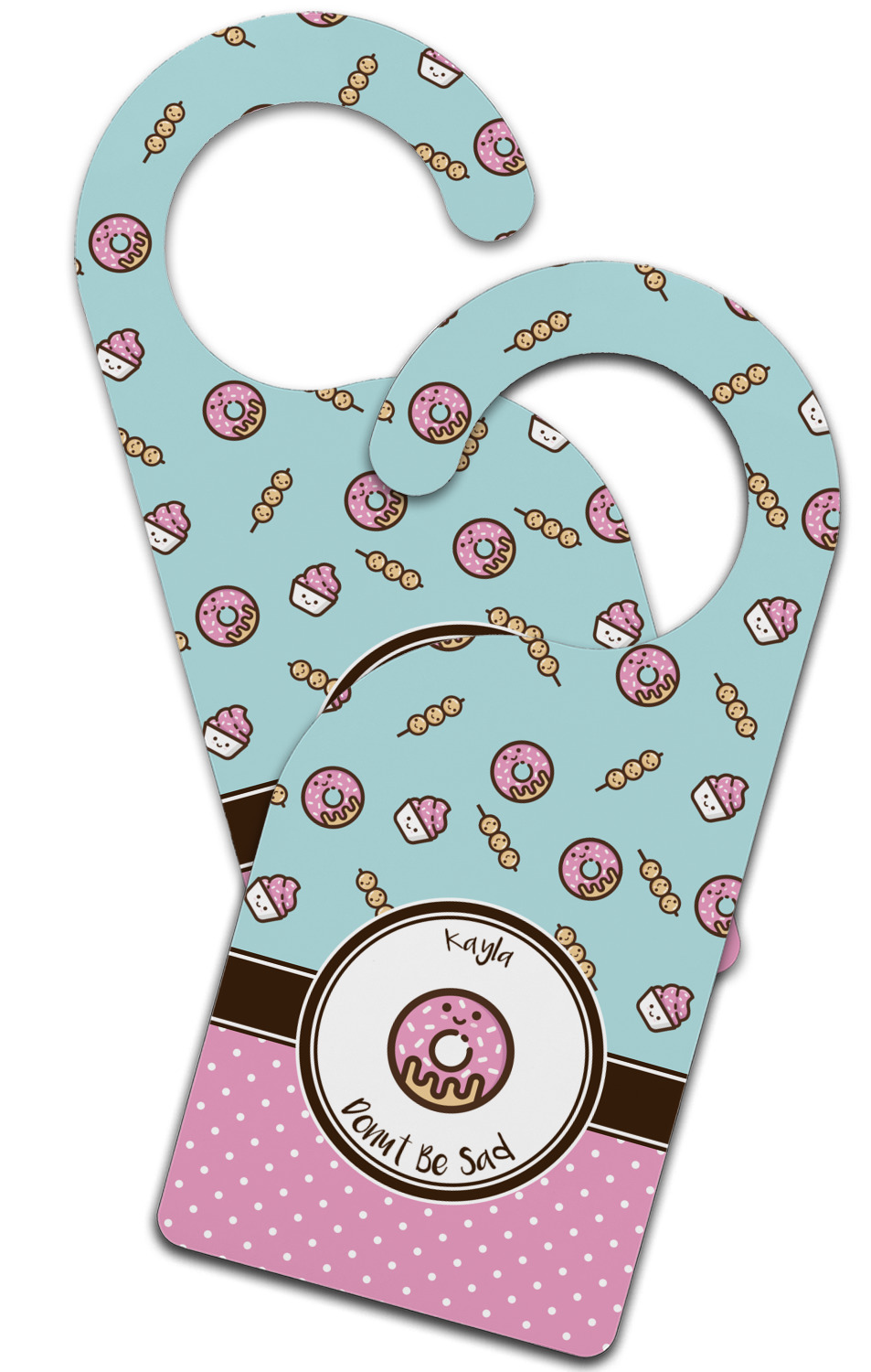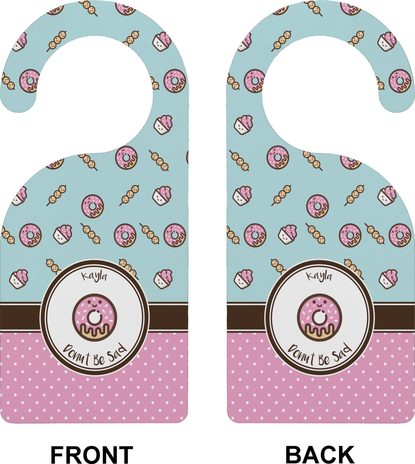 This design is a beautiful light blue/teal and light pink. The top half of the design has a fun pattern with a blue/teal background and pink donuts and other treats. The bottom half is a bright pink polka dot pattern. Each background is divided by a dark brown ribbon. On top of these is a round label with an adorable donut and your personalization right in the middle.