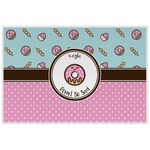 This design is a beautiful light blue/teal and light pink. The top half of the design has a fun pattern with a blue/teal background and pink donuts and other treats. The bottom half is a bright pink polka dot pattern. Each background is divided by a dark brown ribbon. On top of these is a round label with an adorable donut and your personalization right in the middle.