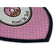 This design is a beautiful light blue/teal and light pink. The top half of the design has a fun pattern with a blue/teal background and pink donuts and other treats. The bottom half is a bright pink polka dot pattern. Each background is divided by a dark brown ribbon. On top of these is a round label with an adorable donut and your personalization right in the middle.
