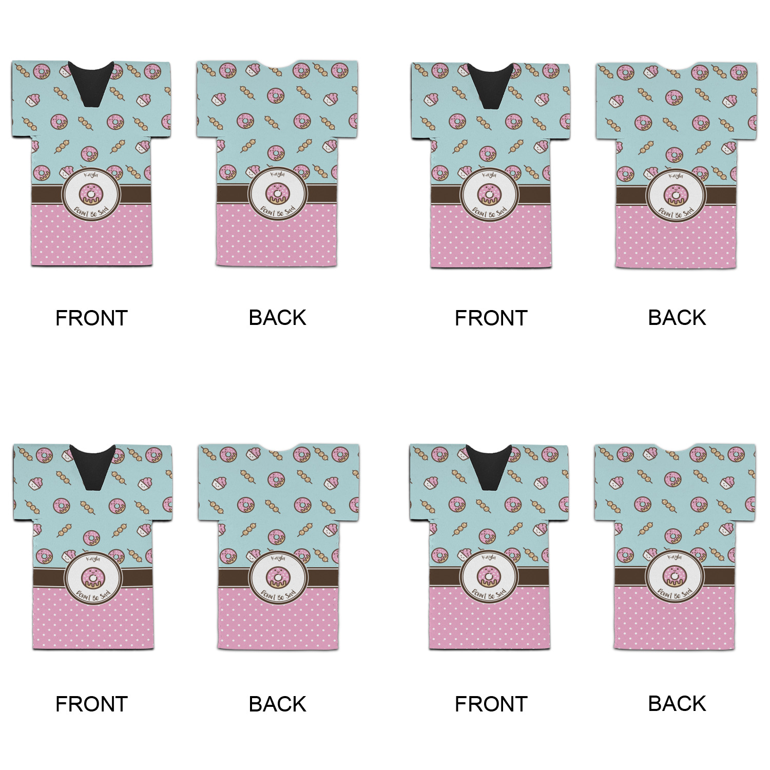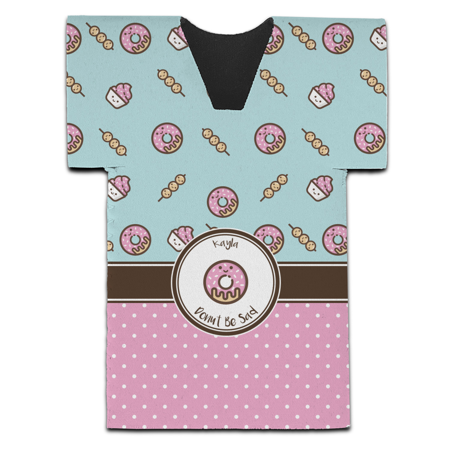 This design is a beautiful light blue/teal and light pink. The top half of the design has a fun pattern with a blue/teal background and pink donuts and other treats. The bottom half is a bright pink polka dot pattern. Each background is divided by a dark brown ribbon. On top of these is a round label with an adorable donut and your personalization right in the middle.