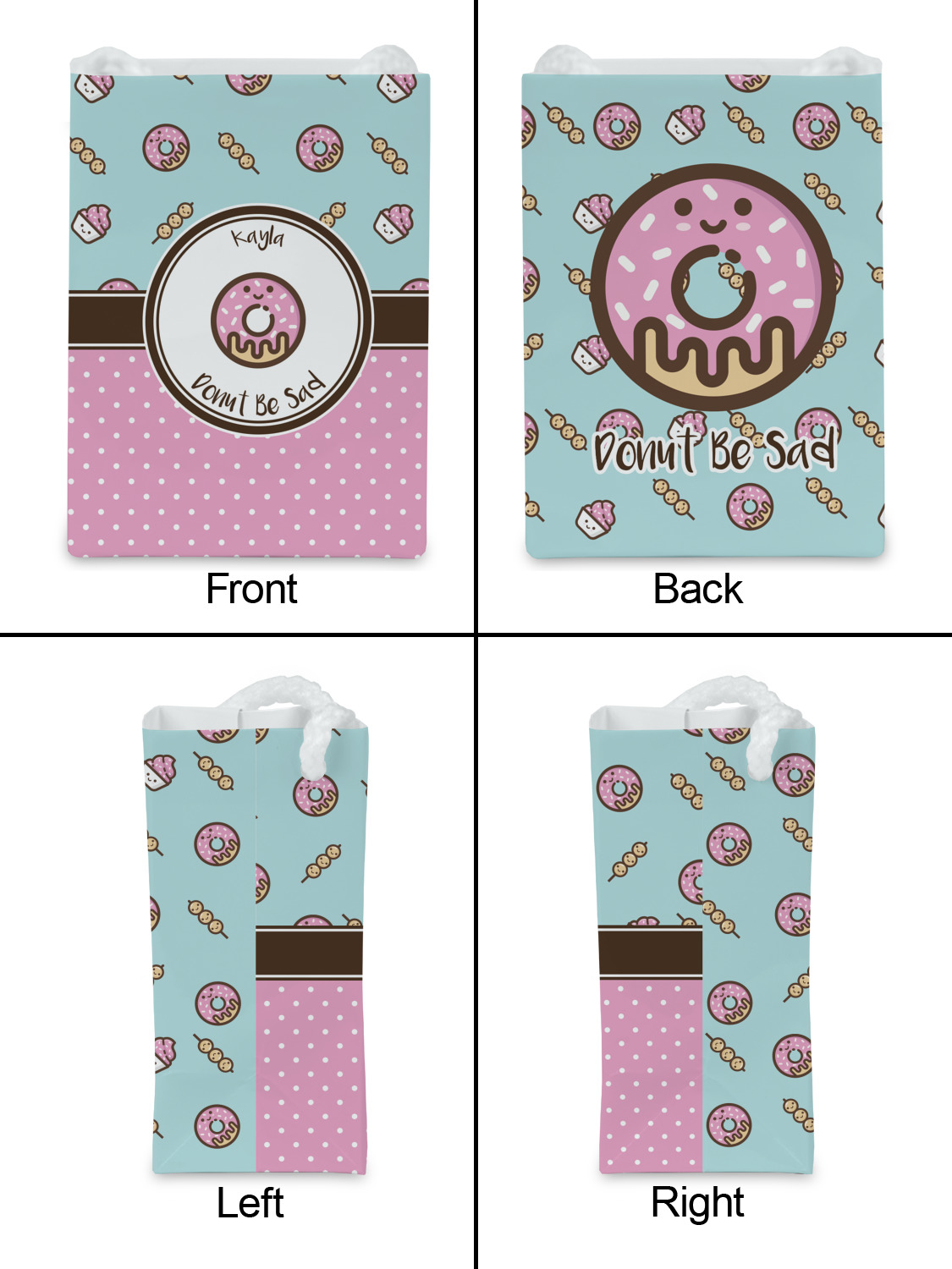This design is a beautiful light blue/teal and light pink. The top half of the design has a fun pattern with a blue/teal background and pink donuts and other treats. The bottom half is a bright pink polka dot pattern. Each background is divided by a dark brown ribbon. On top of these is a round label with an adorable donut and your personalization right in the middle.